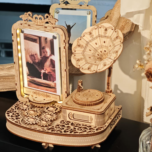 Regular price $34.99 USDRegular priceUnit price / per$45.99 USDSale price $34.99 USDSaleKWASVLYA 3D Wooden Gramophone - Dual-Motion Music Box & Rotating Photo Frame with LED Lights | Vintage Gram-Style Memory Display | 3-Hour Assembly Puzzle (Holds 3x5 Photos)