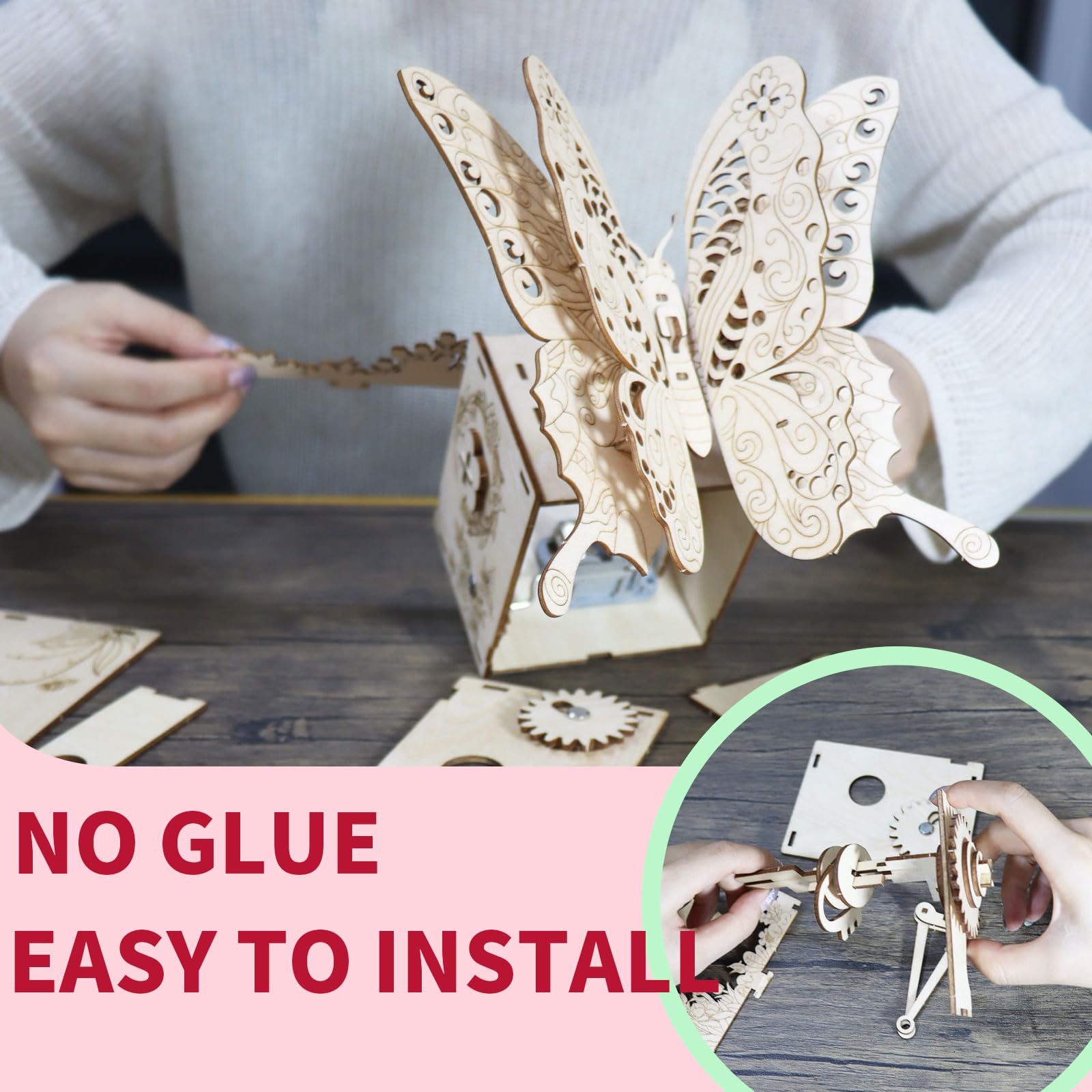- 🦋 【BUTTERFLY WING RHYTHM MUSIC BOX】 67 laser-cut wooden pieces assemble into a DIY music box kit. When You Are My Sunshine plays, the butterfly wings flutter with gears — a 3D wooden puzzle for adults that recreates nature’s delicate charm.