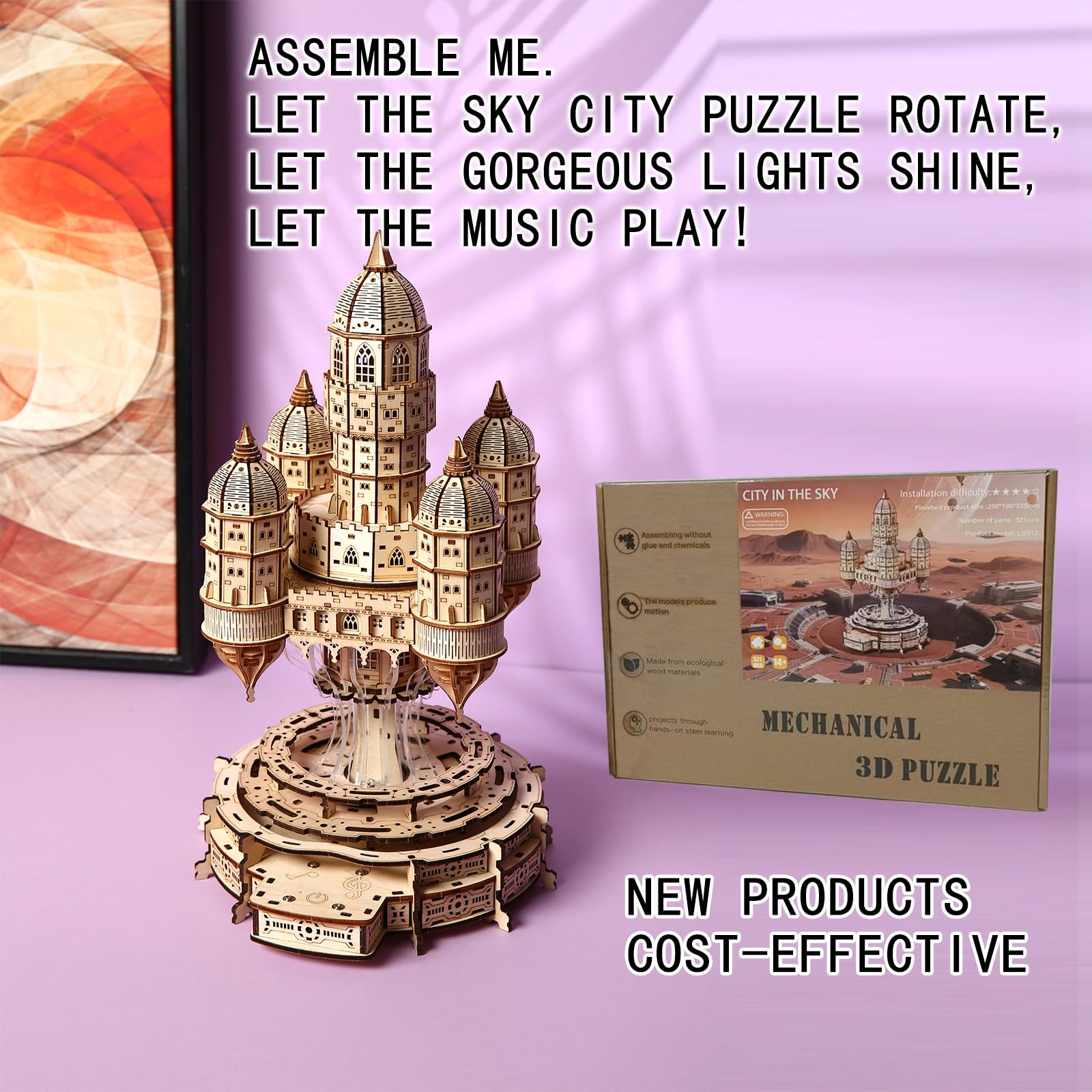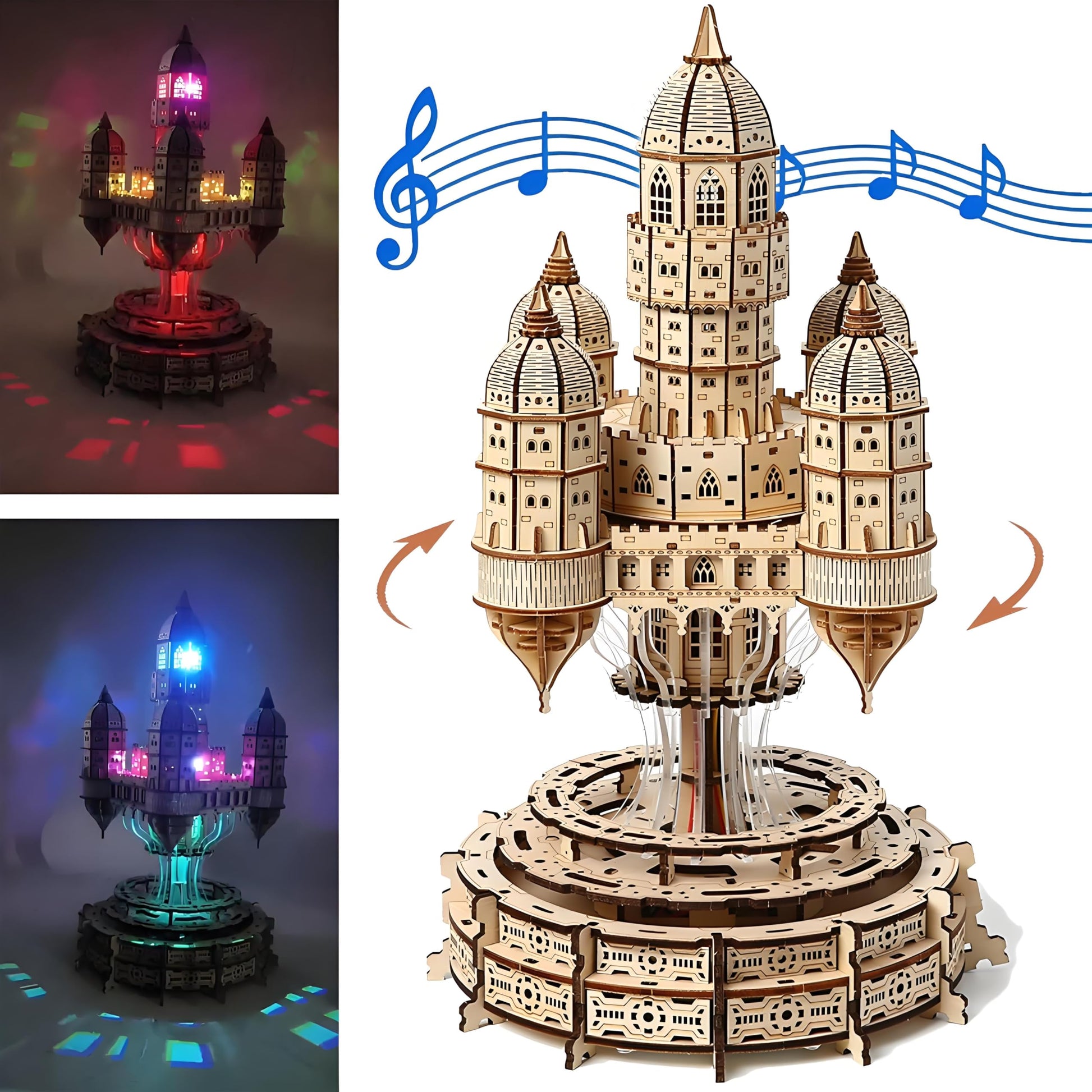 3D Wooden Castle Music Box Puzzle Kit, 521 Pieces LED Light DIY Mechanical Model Building Kit for Adults & Teens,Unique Creative Gift Idea