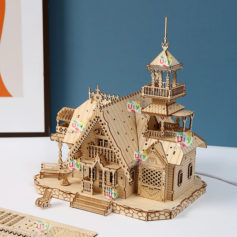 3D Wooden Puzzle Villa House Royal Castle with Light Assembly Toy Kid Adult DIY Model Kits Desk Decoration for Gift