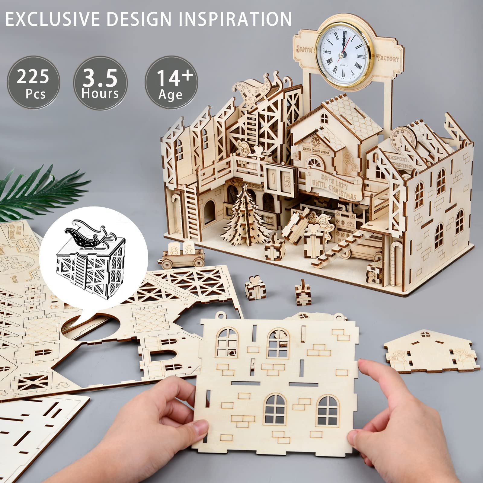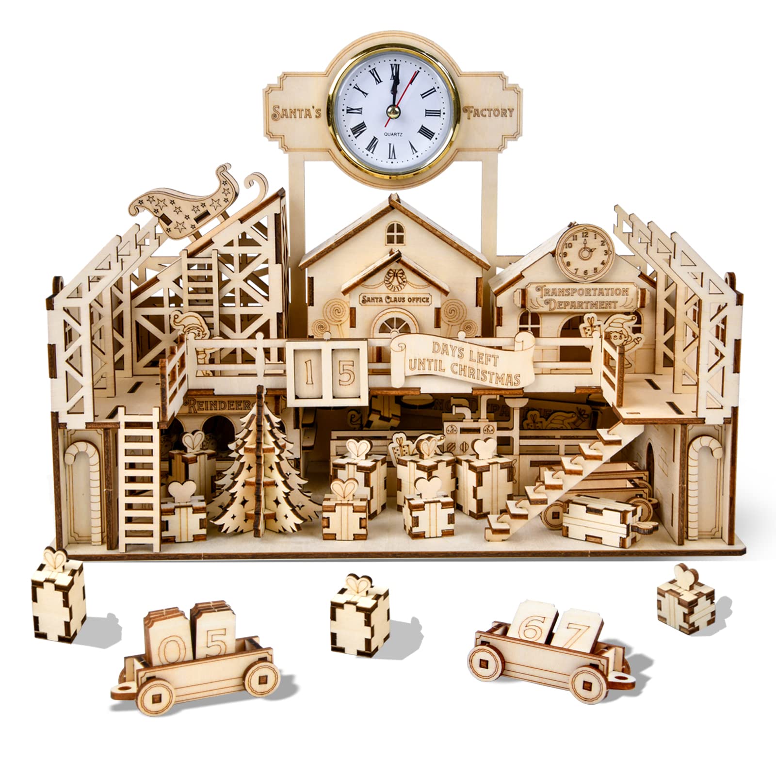 - SAFE AND HIGH-QUALITY MATERIAL: Santa's Factory is crafted from natural basswood, ensuring a safe and long-lasting construction. All pieces are thick and sturdy, securely fitting together. The smooth edges eliminate any potential burrs, guaranteeing a harm-free assembly experience for kids.