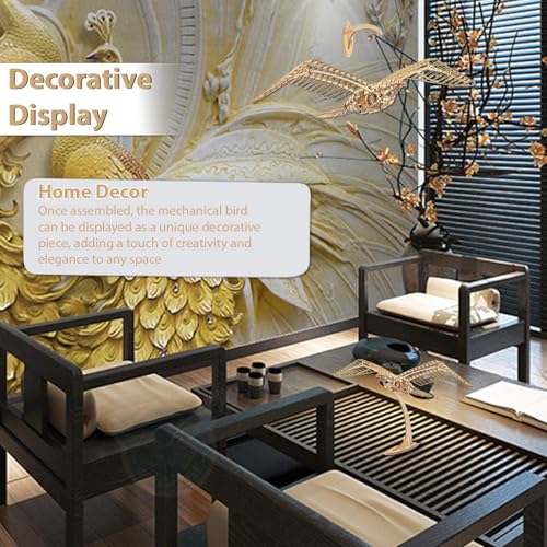 Details: DANCING WINGS FLYING BIRDS WALL DECOR 1000MM MECHANICAL FLYING BIRD - 3D WOODEN MODEL - 3D PUZZLES FOR ADULTS β WOODEN MECHANICAL BIRD TOY BY BITGO HOBBY CAPTIVATING PRESENTATION This 3d mechanical puzzle for adults is captivating and educational kit for enthusiasts of mechanical model building. It blends art and science, providing a hands-on experience in creating a mechanical bird that mimics real flight. KEY FEATURES No Glue Required: As wooden model, it involves assembling multiple parts, usually made of wooden lightweight materials that fit together without the need for glue or other adhesives. Its pieces are often pre-cut, making the assembly process more intuitive. Realistic Moving Parts: This flying bird wall decor aspect the puzzle includes moving parts that simulate a bird's wing flapping motion. Once assembled, bird can perform realistic flight, powered by a manual manipulation, adding dynamic functionality to the model. Encourage Focus: This puzzle bird toys also encourages focus as assembling such a complex model requires attention and concentration. It can be a meditative process that helps reduce stress while providing a sense of accomplishment. Unique Construction: Building this flying bird toy requires a good amount of patience and precision as the pieces must be carefully assembled to ensure the mechanical parts function correctly. It is a rewarding challenge for those who enjoy working with their hands and solving problems. Eye-Catching Impact: This wood bird toy model's key attraction is its aesthetic appeal. This wooden model features detailed patterns on its wings and body, mimicking real feathers and shapes. This striking design makes it an attractive display piece, perfect for showcasing in a home. BENEFITS This mechanical flying bird 3d puzzle offers benefits such as enhancing focus and mindfulness, fostering patience, and providing a rewarding challenge. It combines mechanical engineering with unique design, creating a visually striking model.