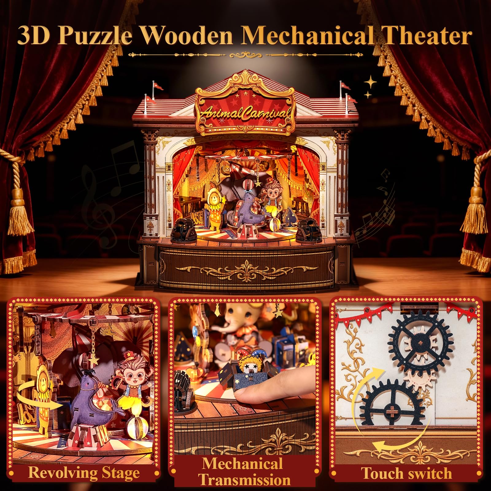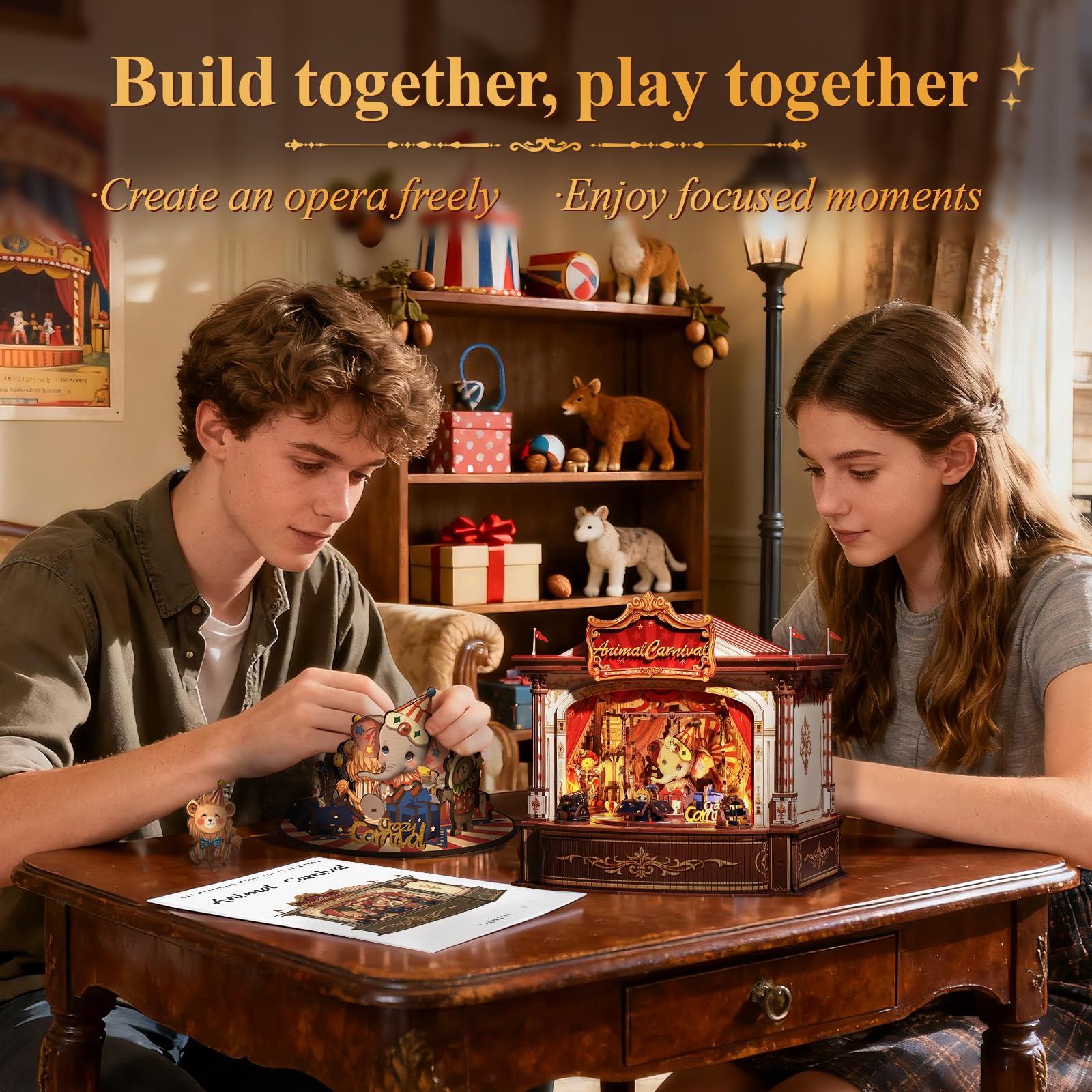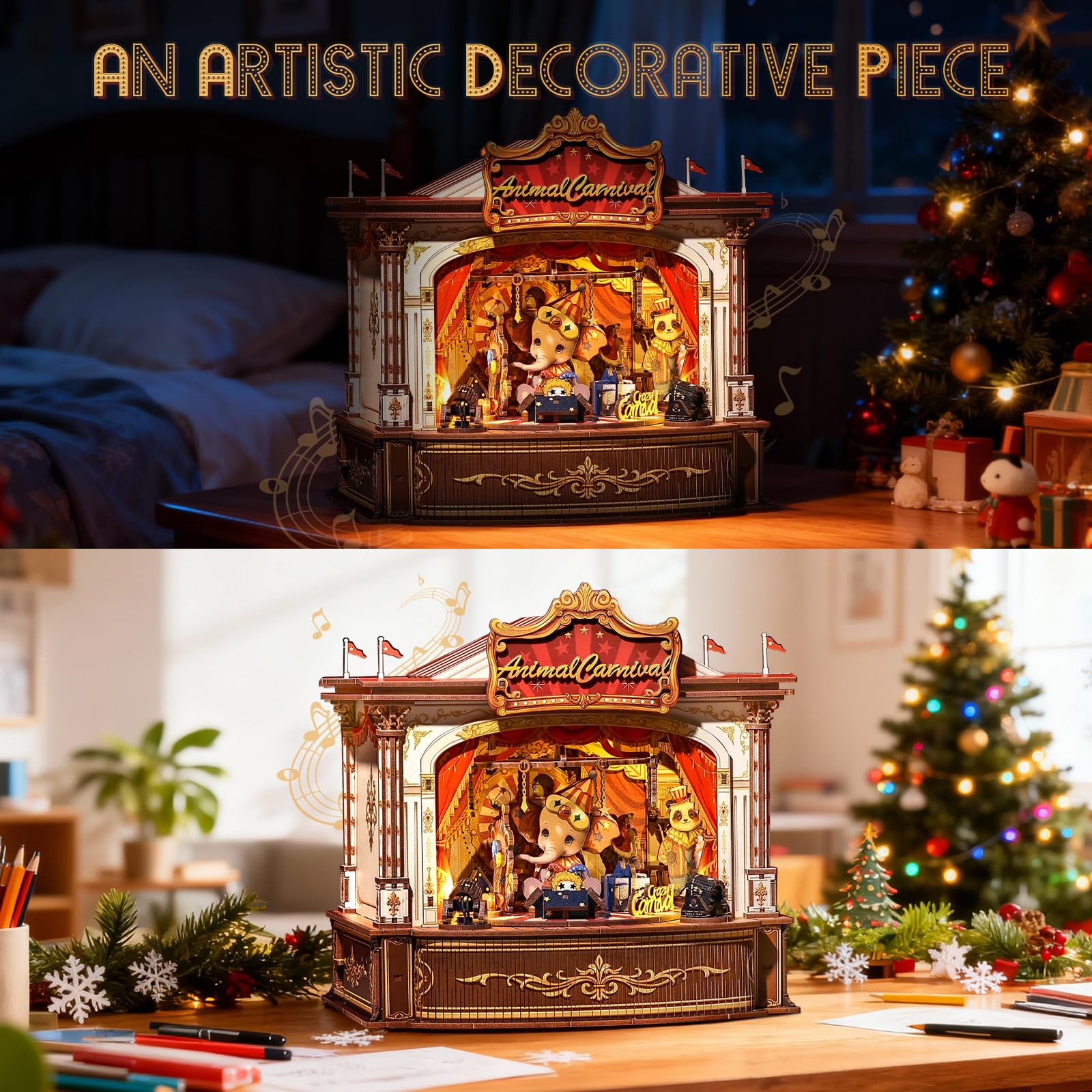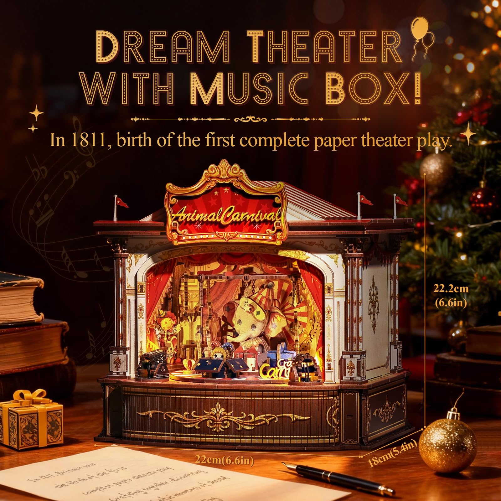 - Animal Carnival - 3D Wooden Puzzles Theater Model Set - Do you recall the joy of childhood carnivals? Twinkling lights, cheerful music, tiny stages—every show was magical. This Animal Carnival Wooden Theater Music Box brings those memories back. As you hand-assemble the stage, you're not just building—you're reliving moments of pure delight. When the melody plays, time seems to slow, and happiness feels simple again.