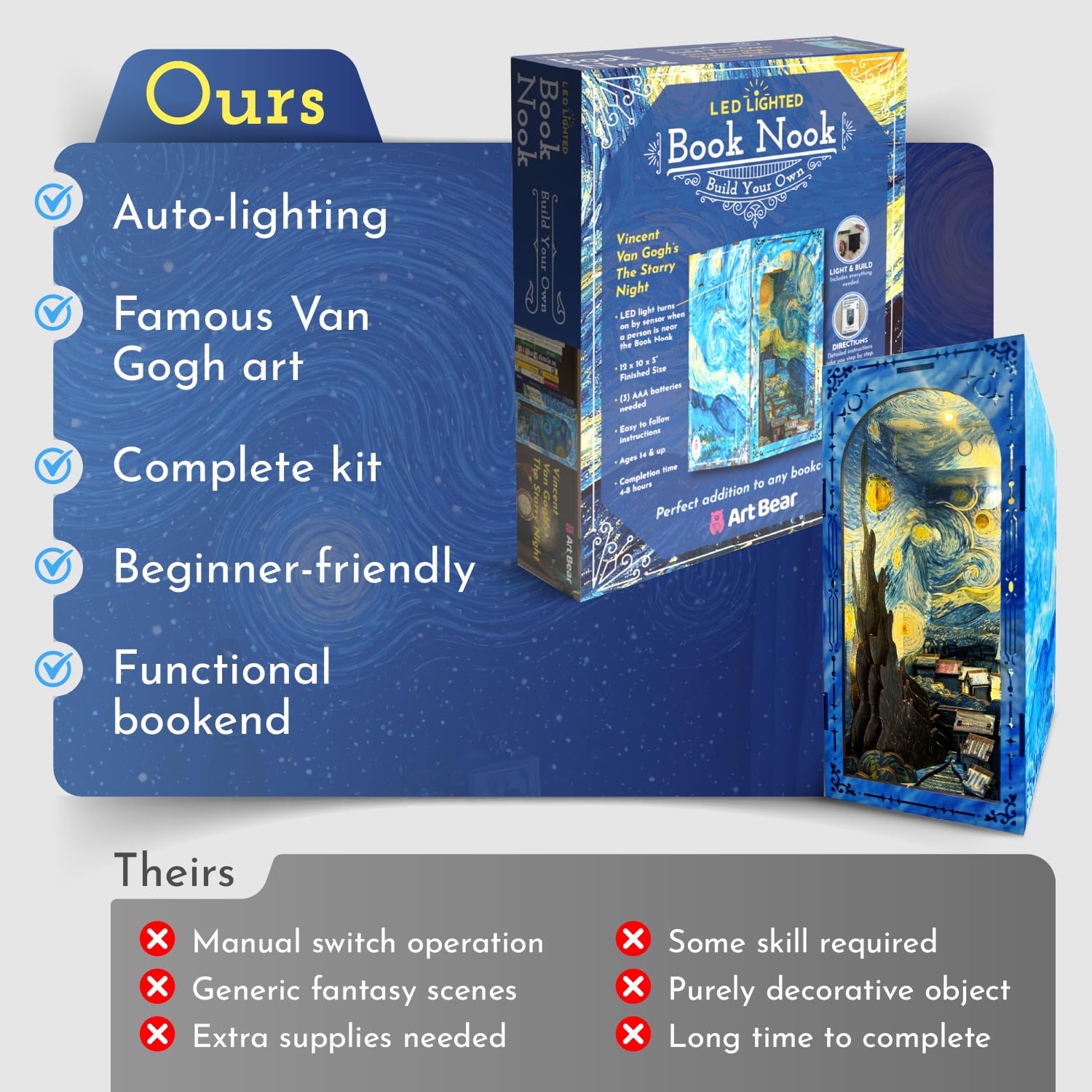 - Artistic Elegance: This DIY book nook kit is designed to bring Starry Night to life on your bookshelf; you can dive into the world of reading nook & build tiny house models together by adding the motion-activated lights and creating a miniature masterpiece
