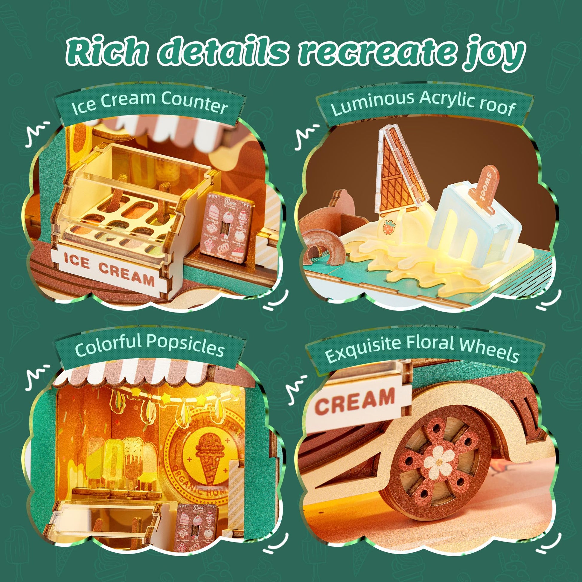 - Detailed Craftsmanship and Quality Materials】 From the ice cream cabinet to the beach-themed base, each detail is thoughtfully designed to evoke the joy of summer. Made from durable, crack-resistant basswood, each piece is securely placed on pre-cut boards, reducing the risk of missing parts and ensuring a smooth assembly experience.