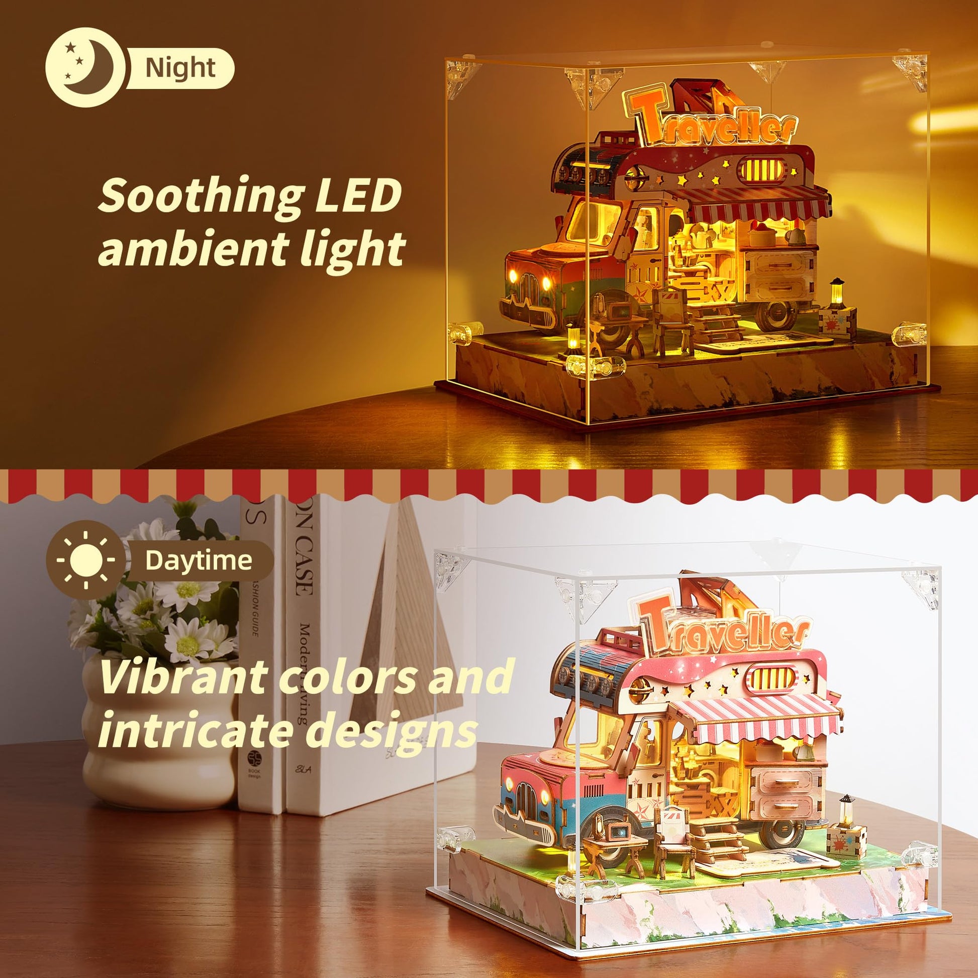 - 【Touch-Activated LED with Enhanced Acrylic Light Effects】 Equipped with LED lights and acrylic panels, this model Bring the spirit of adventure to life with illuminated signs and warm lighting. A touch switch at the base allows you to easily light up the truck, showcasing its charming exterior and detailed interior, ideal for cozy evenings or as a unique home decor accent.