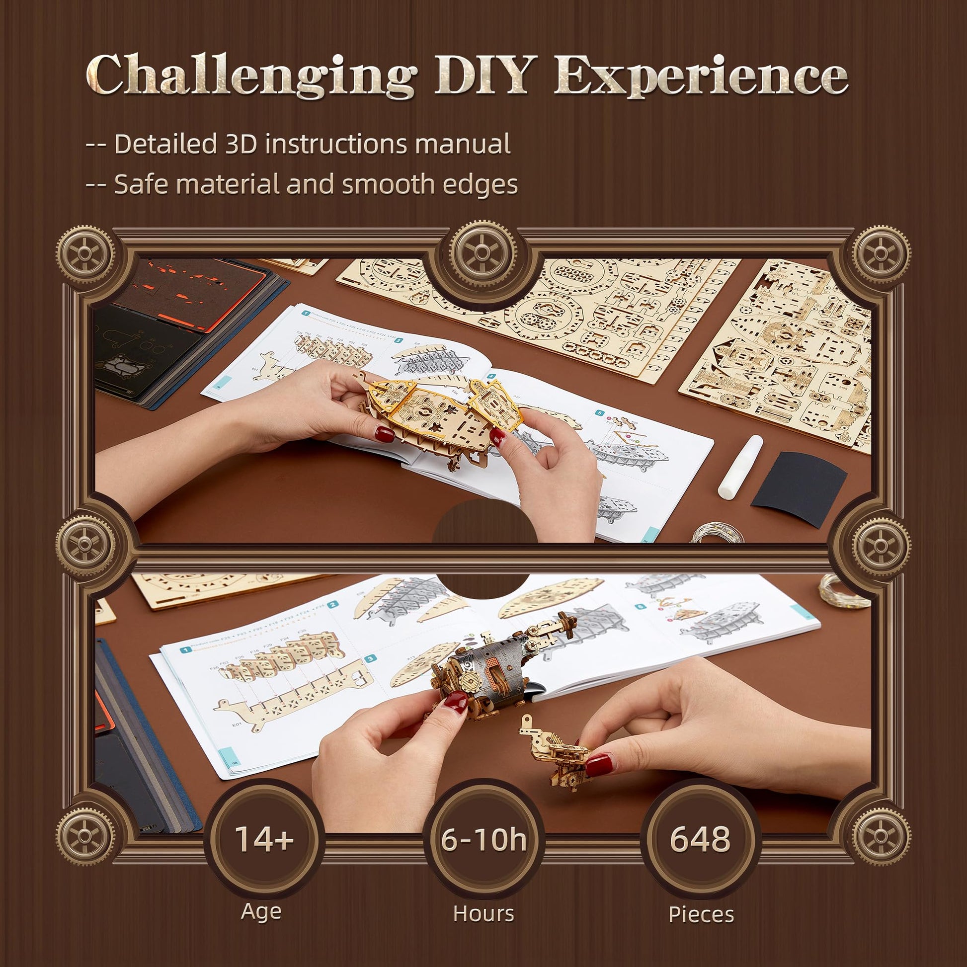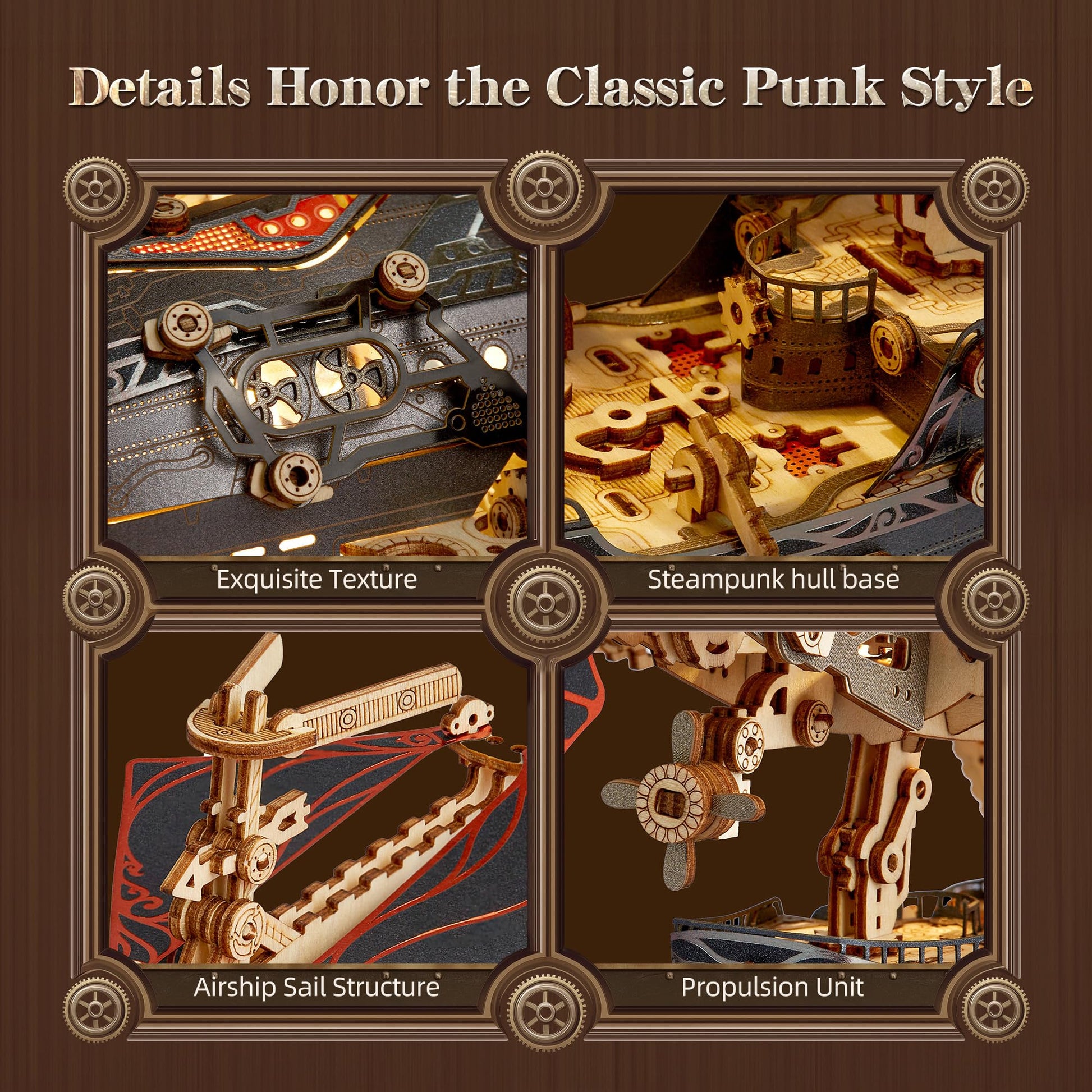 - 【Steampunk Fantasy Airship Design】Experience the wonder of the sky with this 3D wooden airship puzzle. Inspired by the enchanting steampunk style, it boasts intricate textures and a stunning design, complete with a mesmerizing LED light display that sparks creativity and wonder.