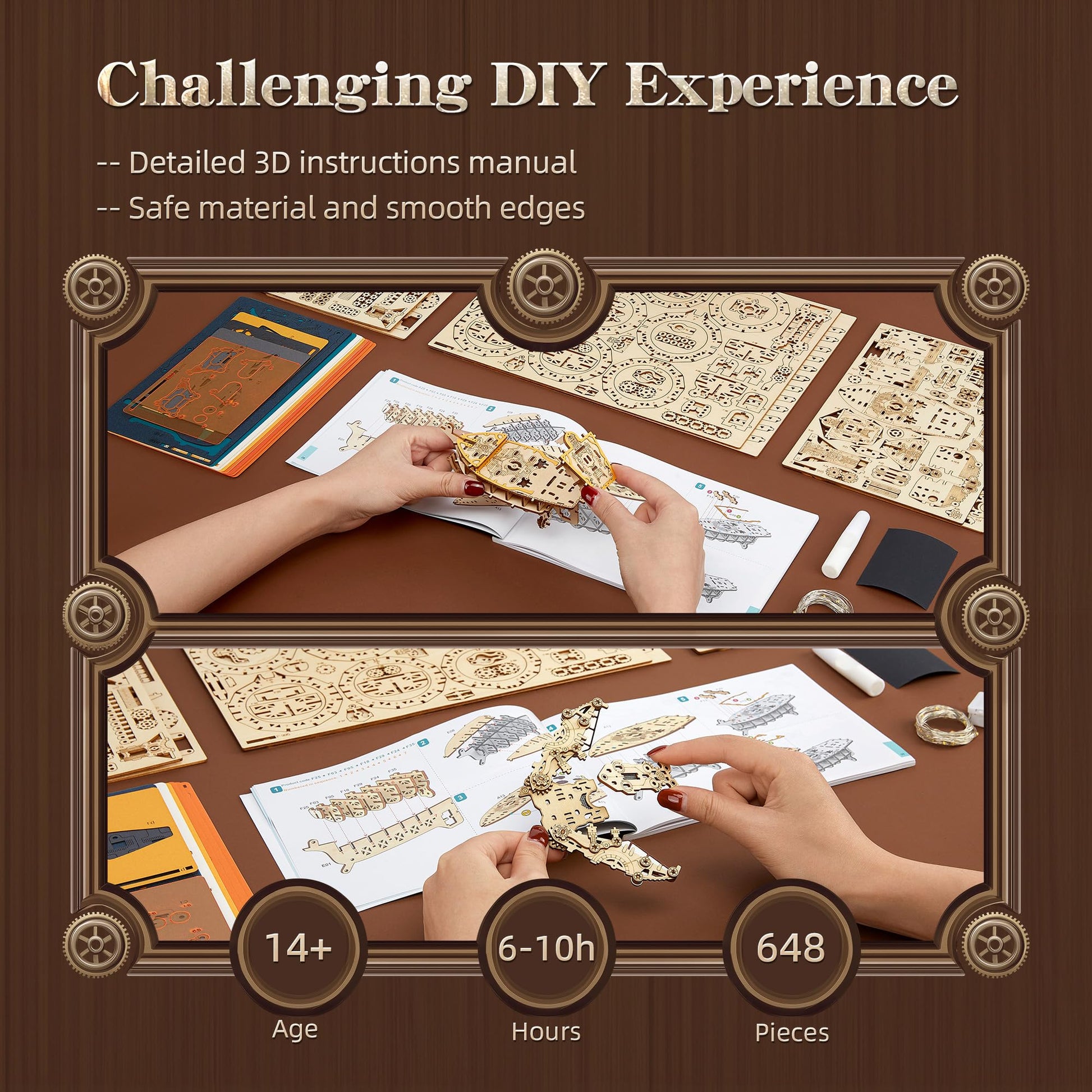 - 【Steampunk Fantasy Airship Design】Experience the wonder of the sky with this 3D wooden airship puzzle. Inspired by the enchanting steampunk style, it boasts intricate textures and a stunning design, complete with a mesmerizing LED light display that sparks creativity and wonder.