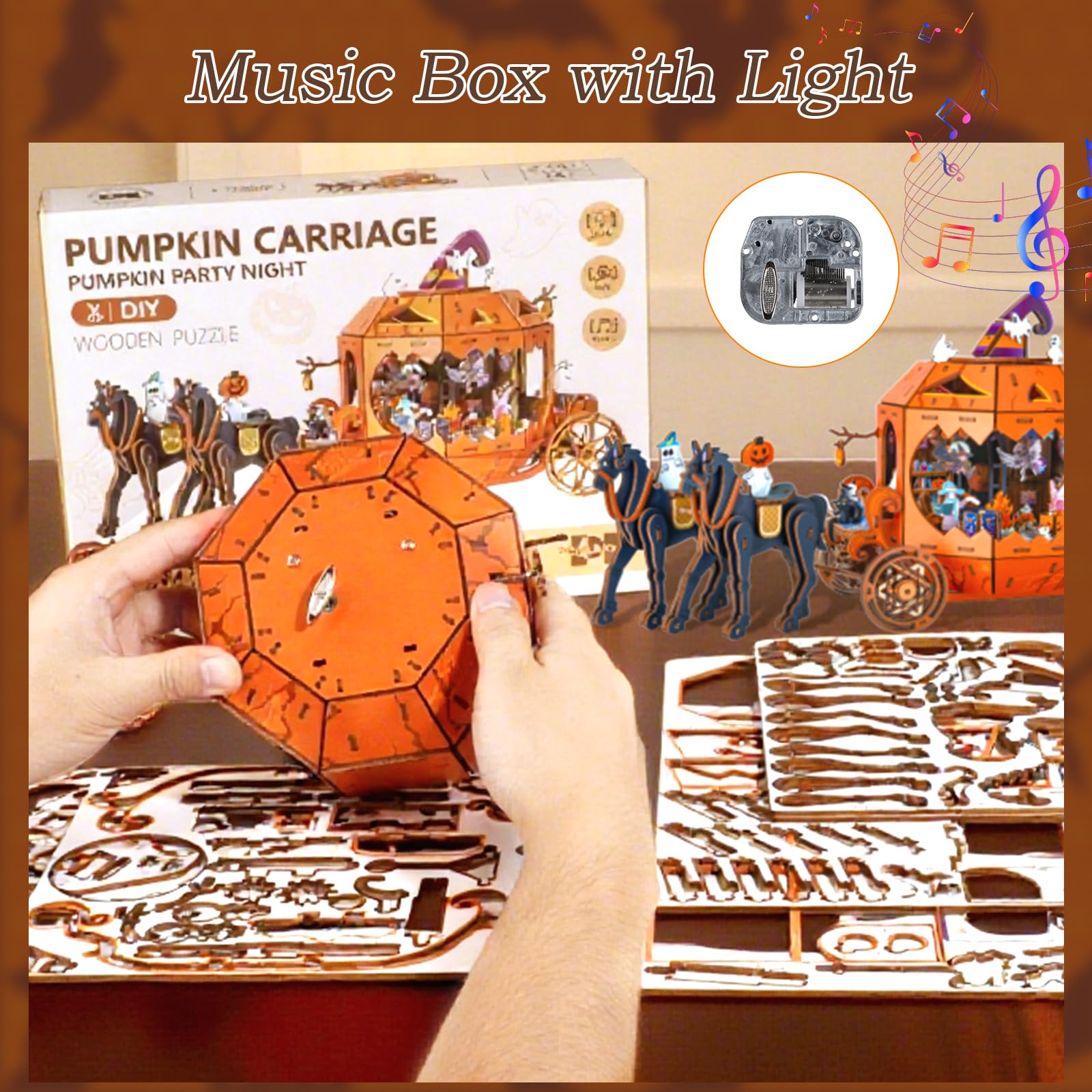- Boo Basket Stuffers – Create Halloween toy magic with this 274-piece wooden pumpkin carriage puzzle. A rewarding DIY project that combines creativity and fun for teens, adults, and families. Once assembled, enjoy the enchanting lights, festive music, and rolling carriage action for endless spooky delight and seasonal celebration.