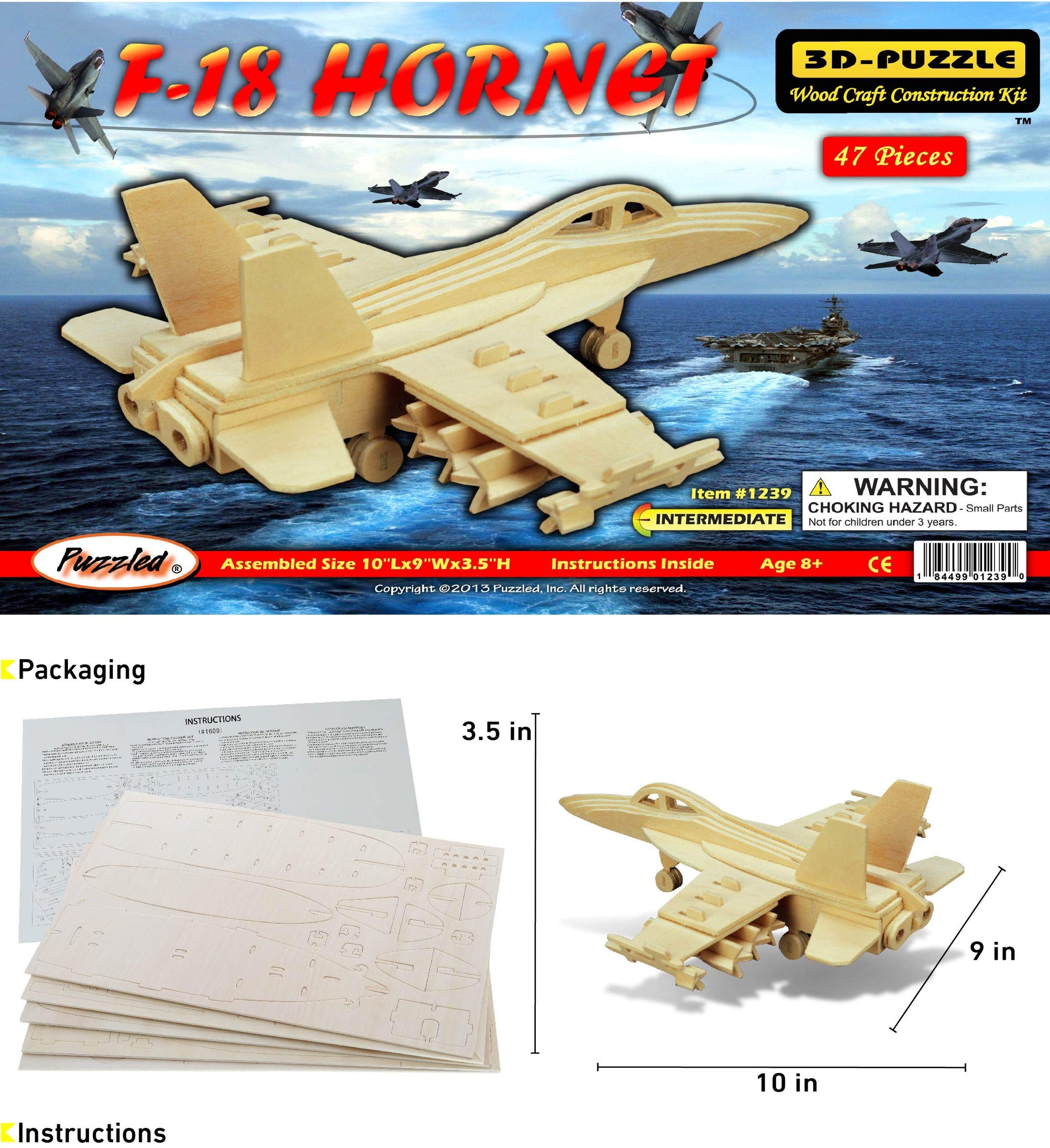 - INCLUDED IN THE PURCHASE OF F18 HORNET MODEL 3D PUZZLE - Includes 1 Puzzled F-18 Hornet Fighter Plane Model Kit that comes with 47 interlocking puzzle pieces, 1 instruction manual, and 1 paper for sanding. Aircraft model kits feature precise laser-cut pieces and clear instructions, so the building process is a fun experience for puzzle lovers ages 8 and up. 3D Wooden Building Airplane Kit measures 10Lx9Wx3.5H inches. Paint and glue not included.