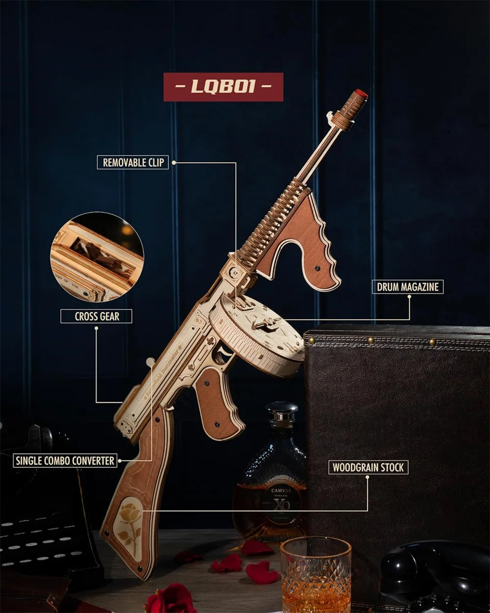 Experience the thrill of craftsmanship with this highly detailed wooden model kit, inspired by the iconic Thompson Submachine Gun (M1928). From the authentic circular cooling barrel and press-loading magazine to the distinctive stock and frame, this 3D puzzle recreates the classic visual and mechanical elements of the legendary firearm with remarkable accuracy.