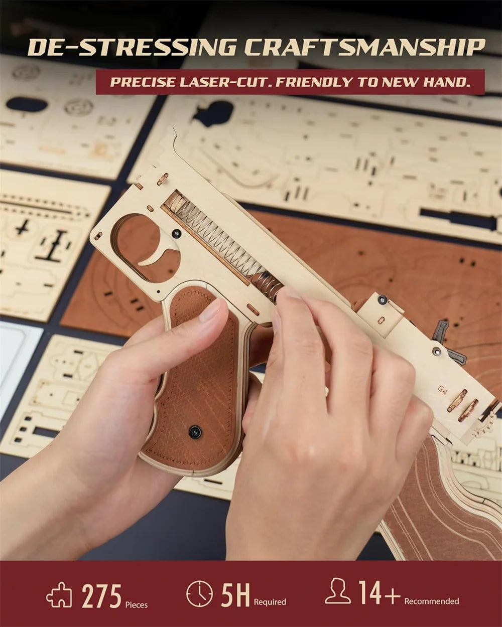 More than a static model, this wooden puzzle functions as a rubber band gun capable of firing up to 5 shots per second. Featuring an ejection-shell mechanism, the model simulates realistic shell throws during each shot, offering an exciting and hands-on play experience.