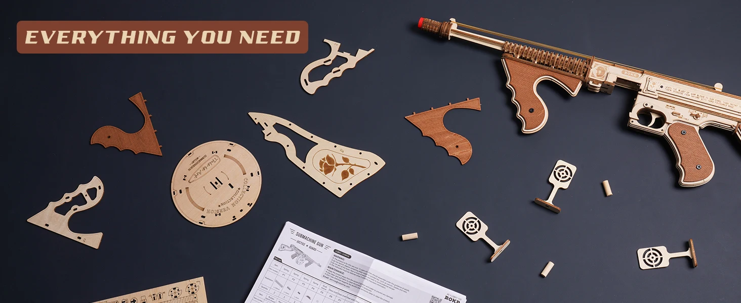 Robotime 3D Wooden Puzzle Thompson Submachine Toy Model Building Kits with Rubber Band for Adults