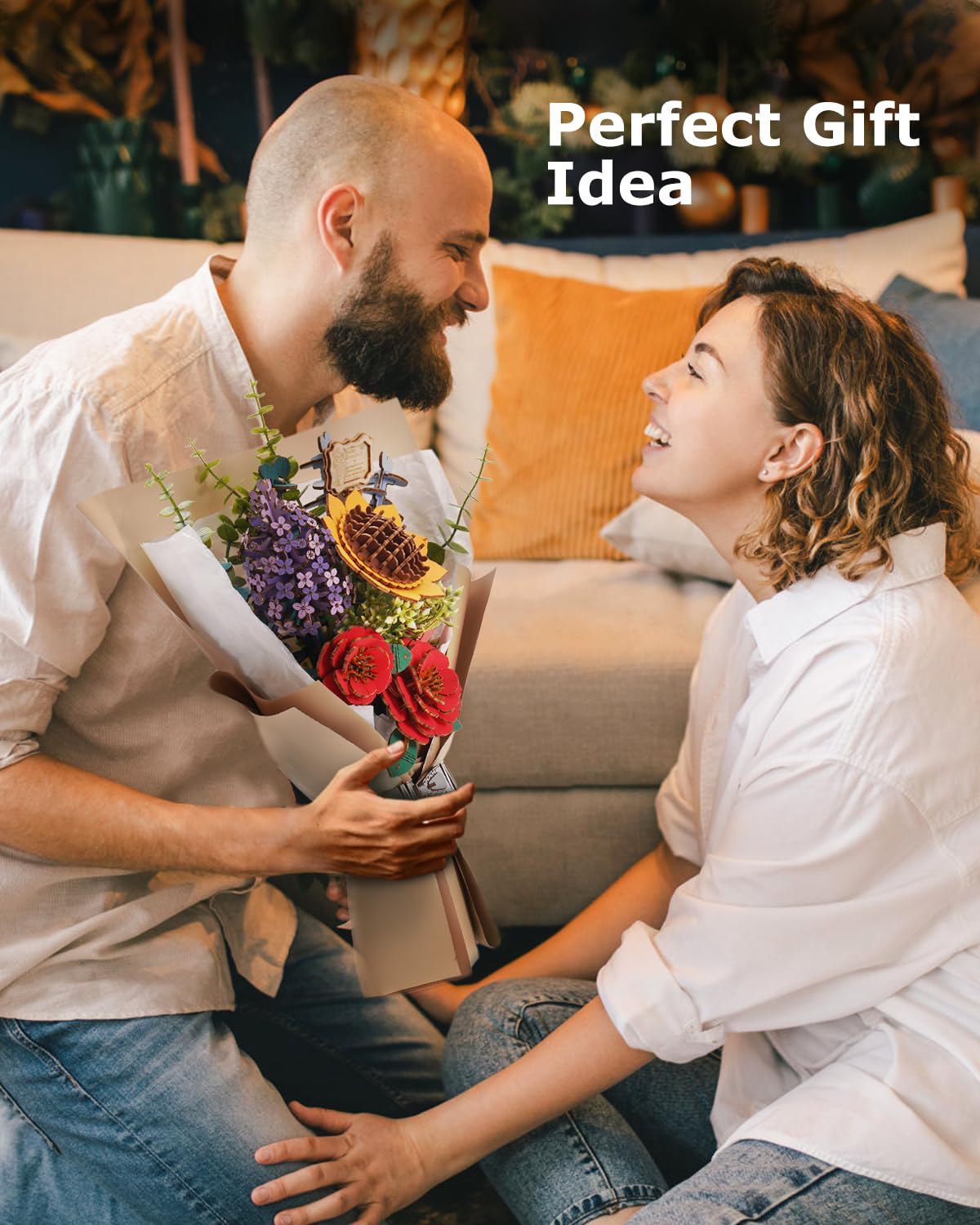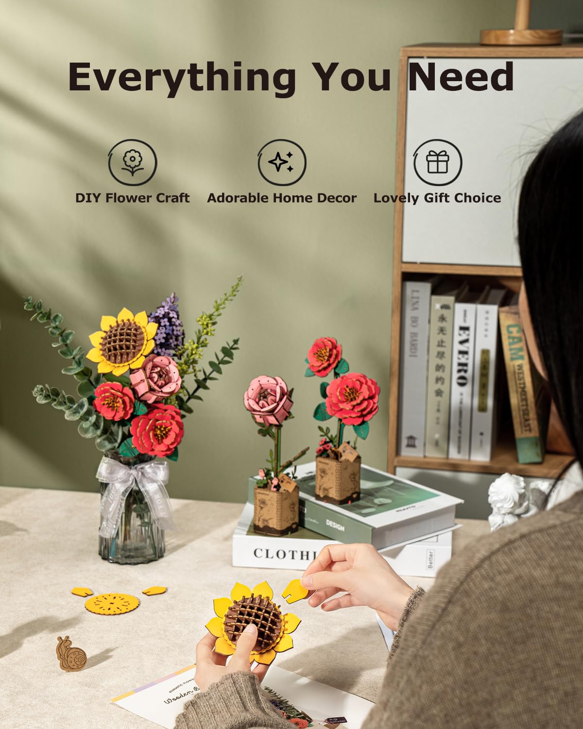 ROBOTIME Forever Flowers Bouquet, Wooden Flower Bouquet Building Kit TW01H, Sunflower/Red Camellia/Pink Rose/Lilac Gift for Mom/Wife