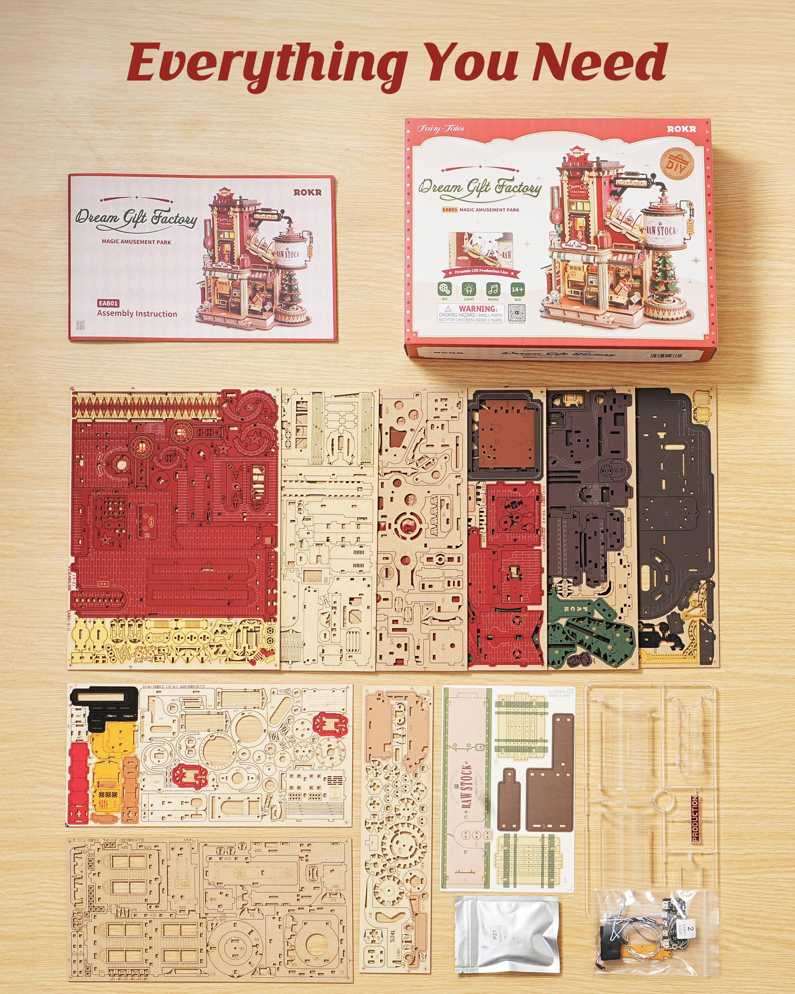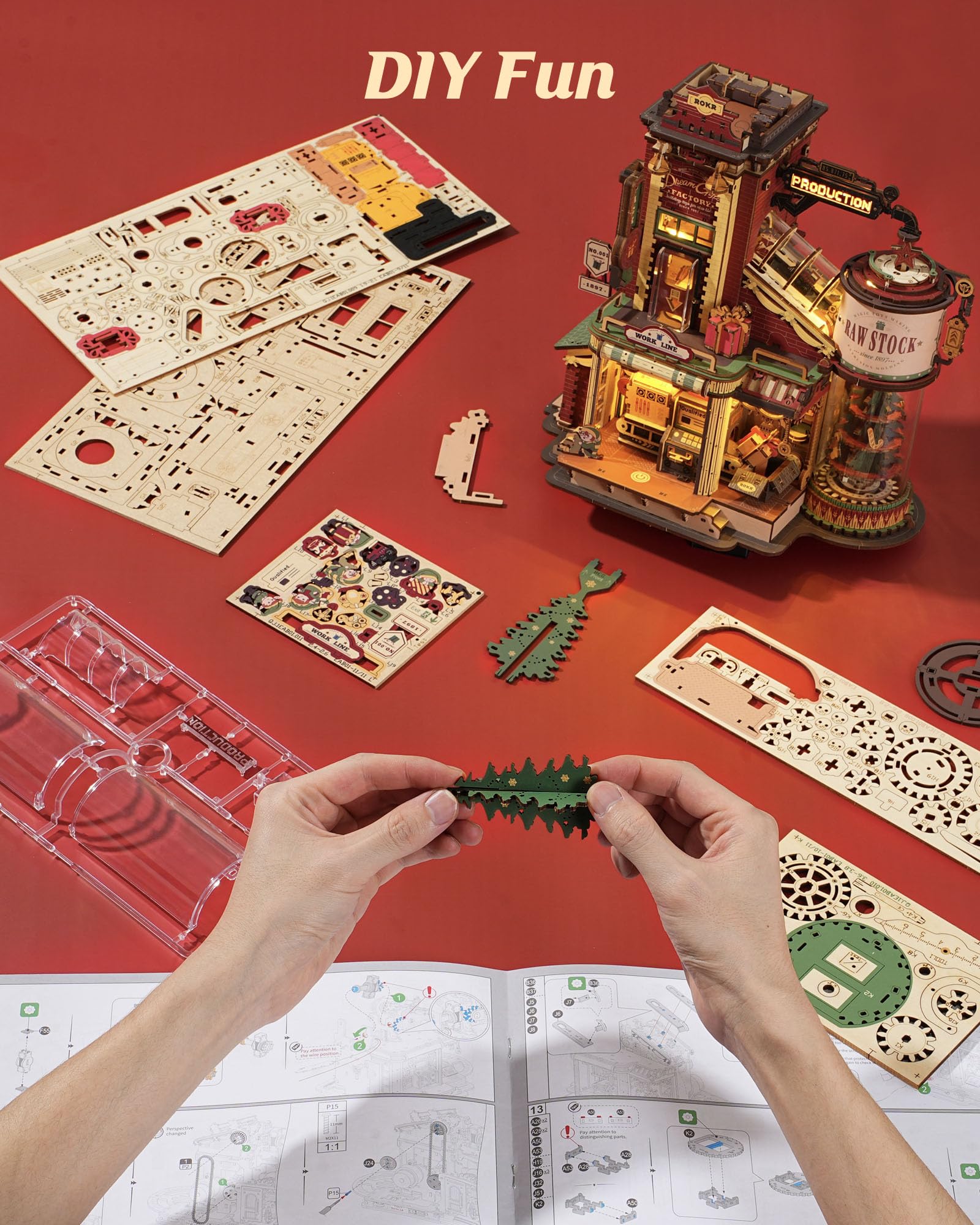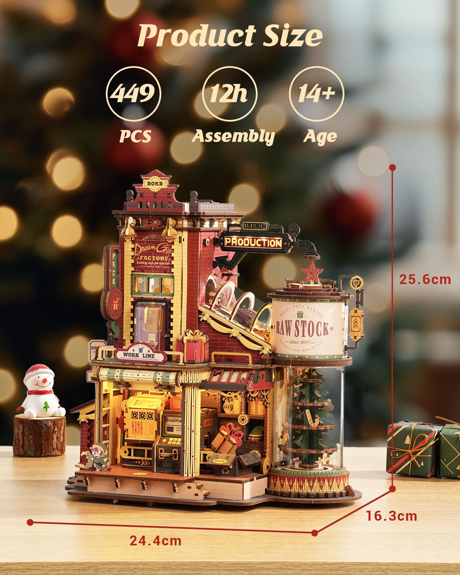 - 【Build a Gift Factory】Assemble your own wooden gift factory with 449 natural plywood pieces. Once completed, watch conveyor belts rotate, chimneys glow, and mechanical elves move. Six LED zones sync with holiday music through a single motor system. This is a perfect example of the innovative and interactive 3D wooden puzzles offered by ROKR.