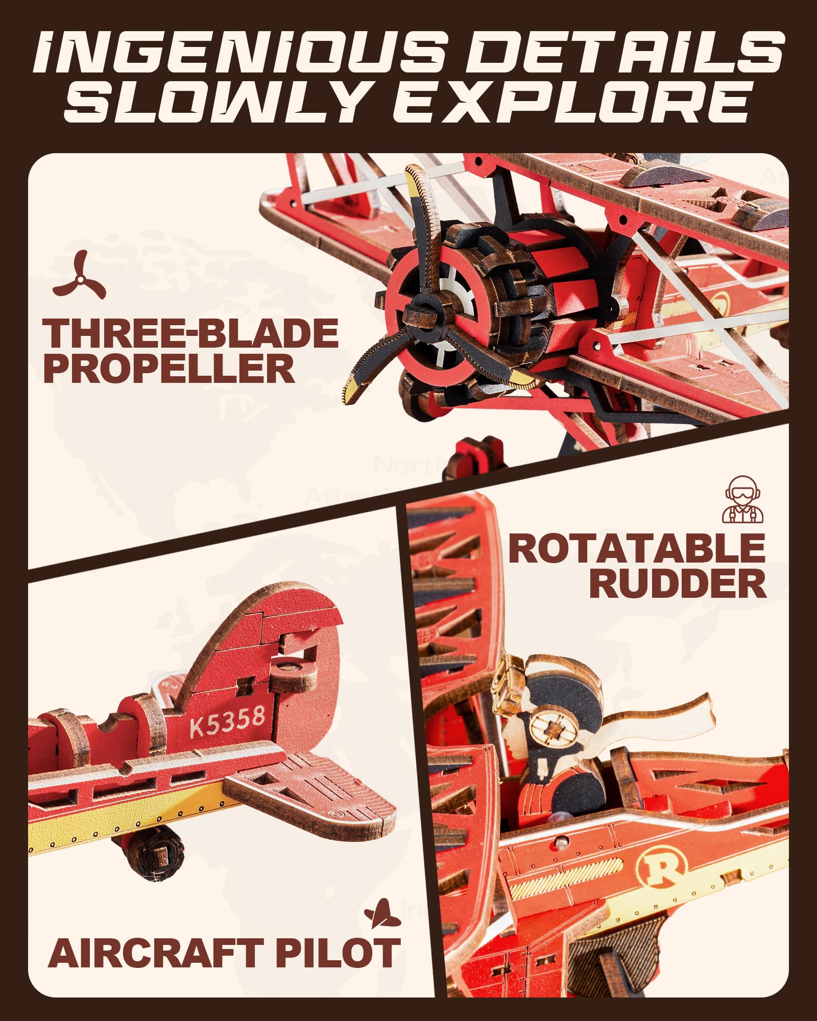 - [Gravity Swing]This wooden puzzle combines assembly, entertainment, and decor into one stunning piece. Once completed, it beautifully replicates a classic biplane gladiator from the last century, making it a perfect display for aviation enthusiasts and history lovers alike.