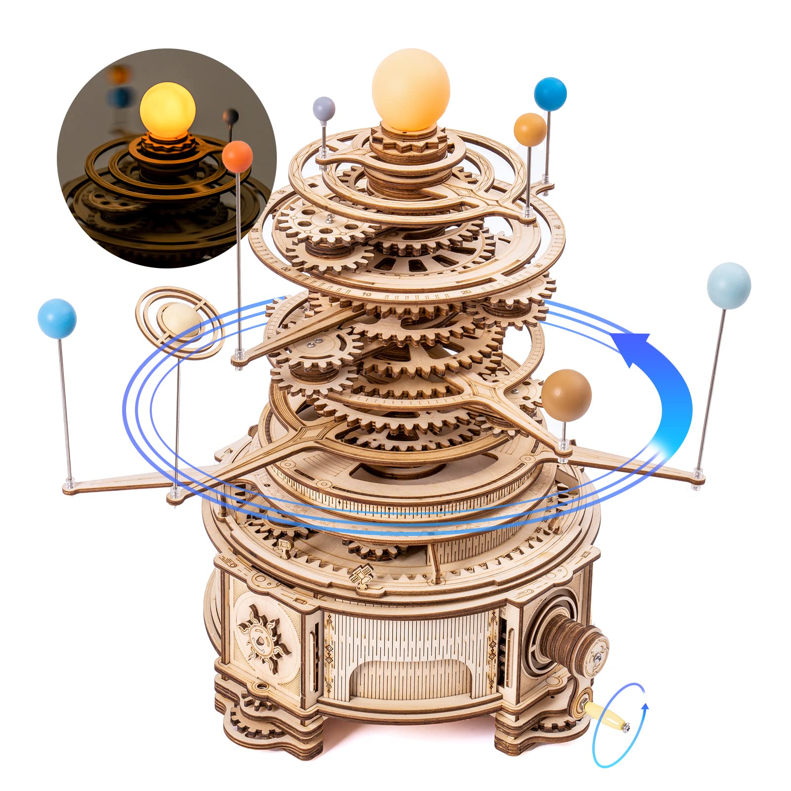 - ORBITING SOLAR SYSTEM: This 3D puzzle model kit shows the relative positions of solar system. When cranking the handle, you will see the Sun glowing and the 8 planets orbiting around it.