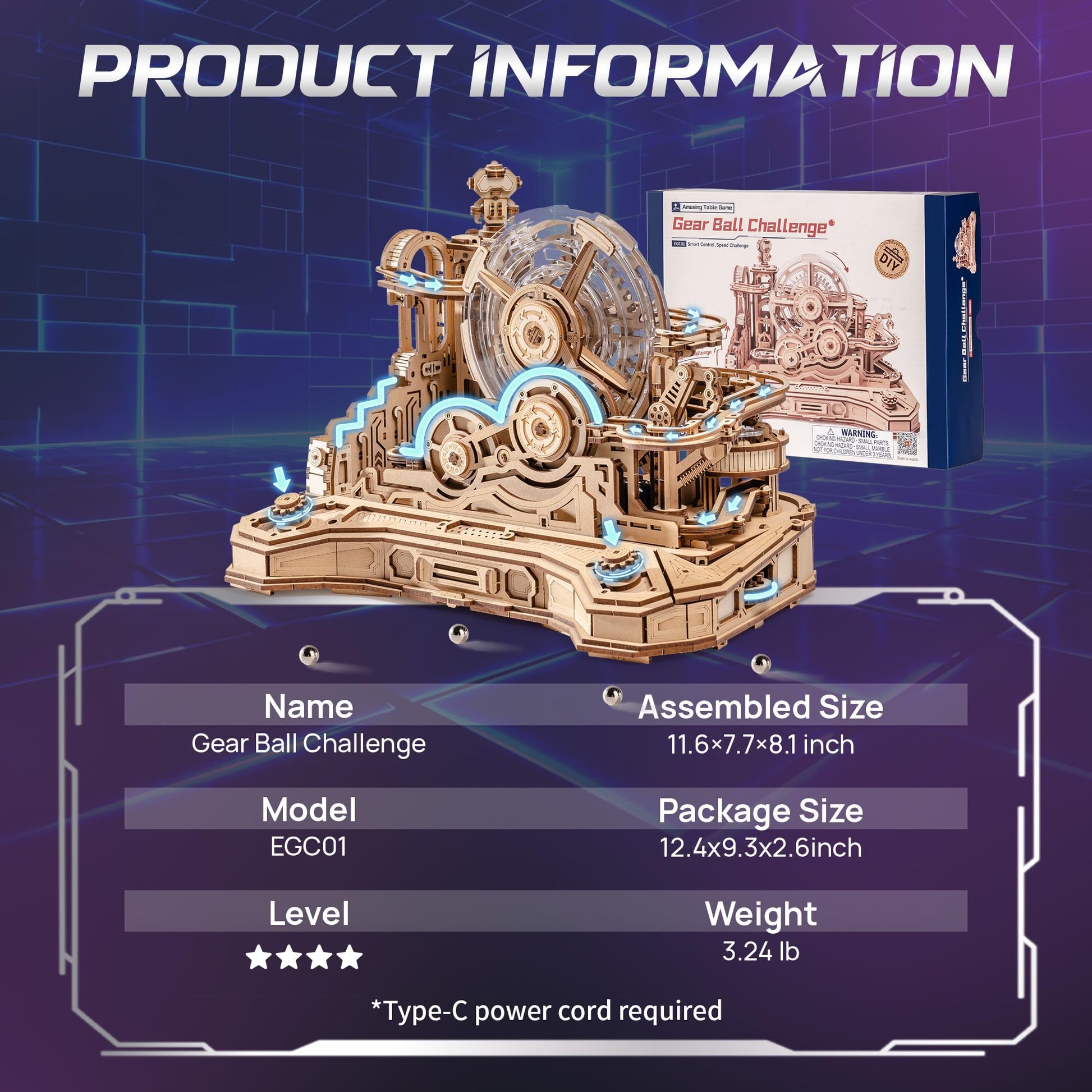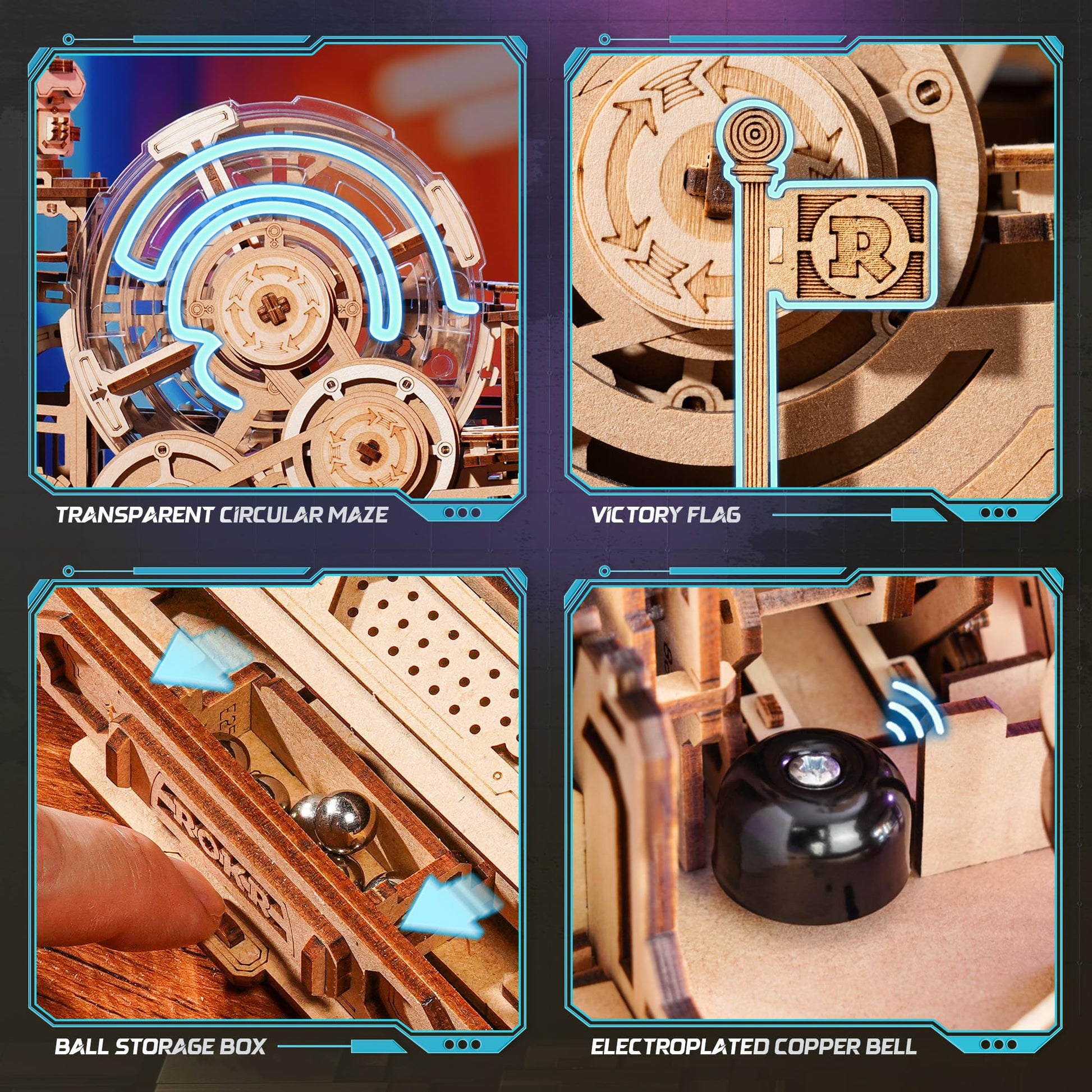 - 【ROKR Gear Ball Challenge】Experience thrilling dynamic challenges with ROKR 3d Wooden puzzles Pinball Machine.This interactive puzzle features 6 mechanisms,5-tier tracks, and 4 key controls for precise ball navigation with real-time path adjustments. The transparent circular maze provides full visibility of the ball's movement. Success triggers a bell sound and raises a victory flag.