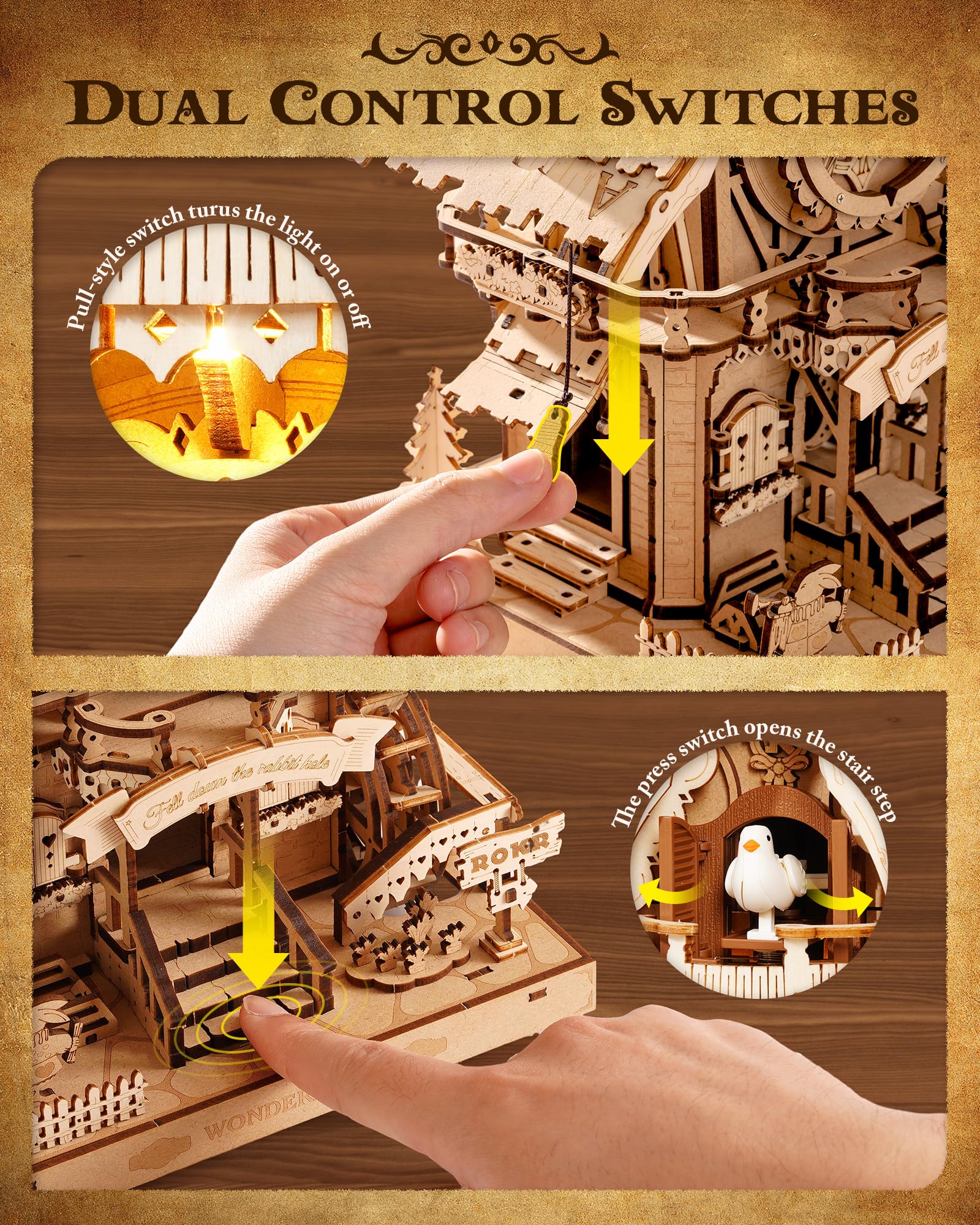 - [Three-Layer Thematic Design]Intricately crafted with layered wooden panels, rich vintage wood grain, and detailed thematic engravings, making it a stunning decorative piece for any room.