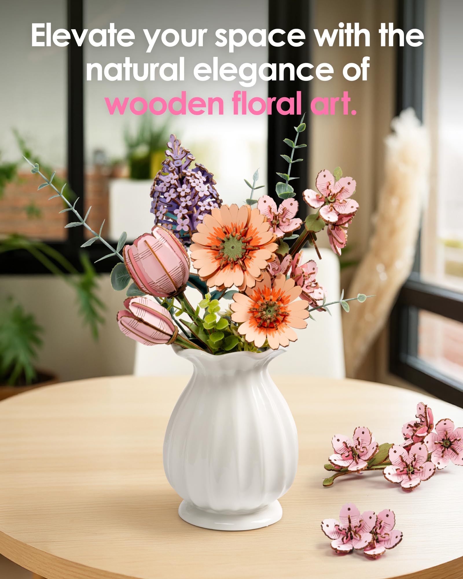 - [Versatile Home Décor Accent] - Enhance your living space with the timeless charm of 3d puzzle wooden flowers building set. Display them individually in the included cardboard base or arrange them in your favorite vase for a stunning centerpiece. Add a touch of elegance to any room with these exquisite floral creations.