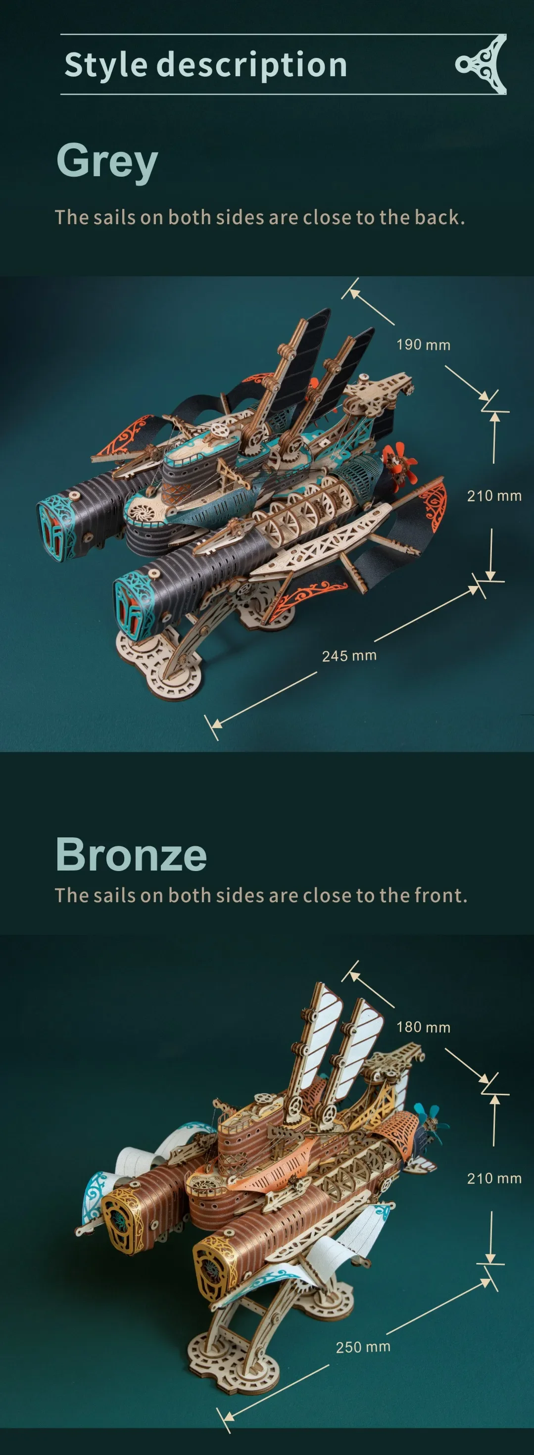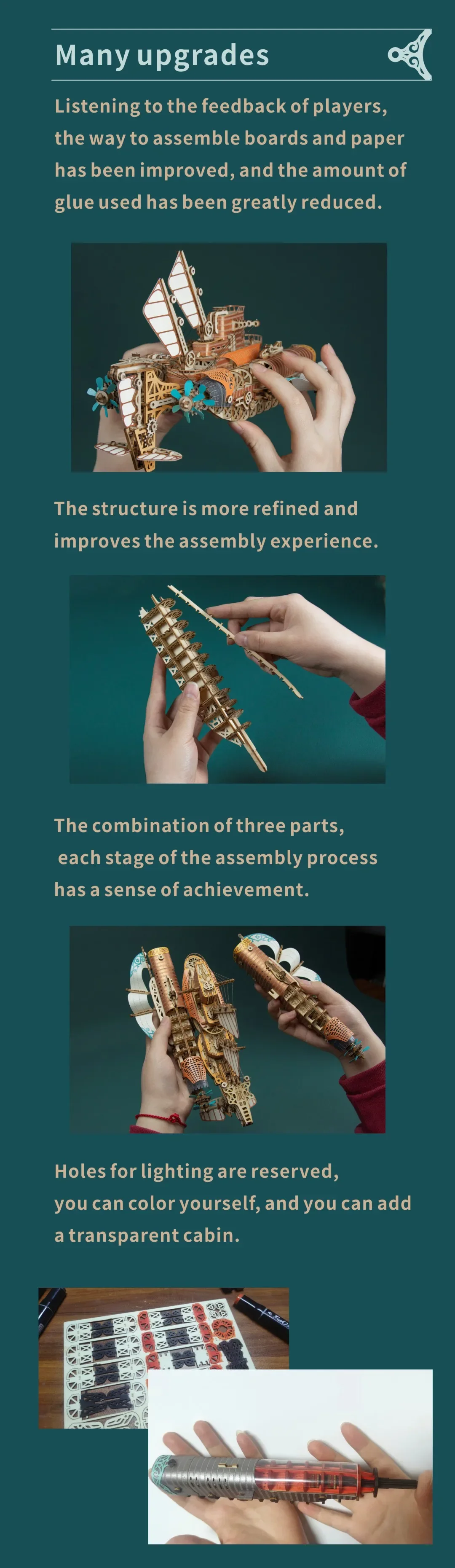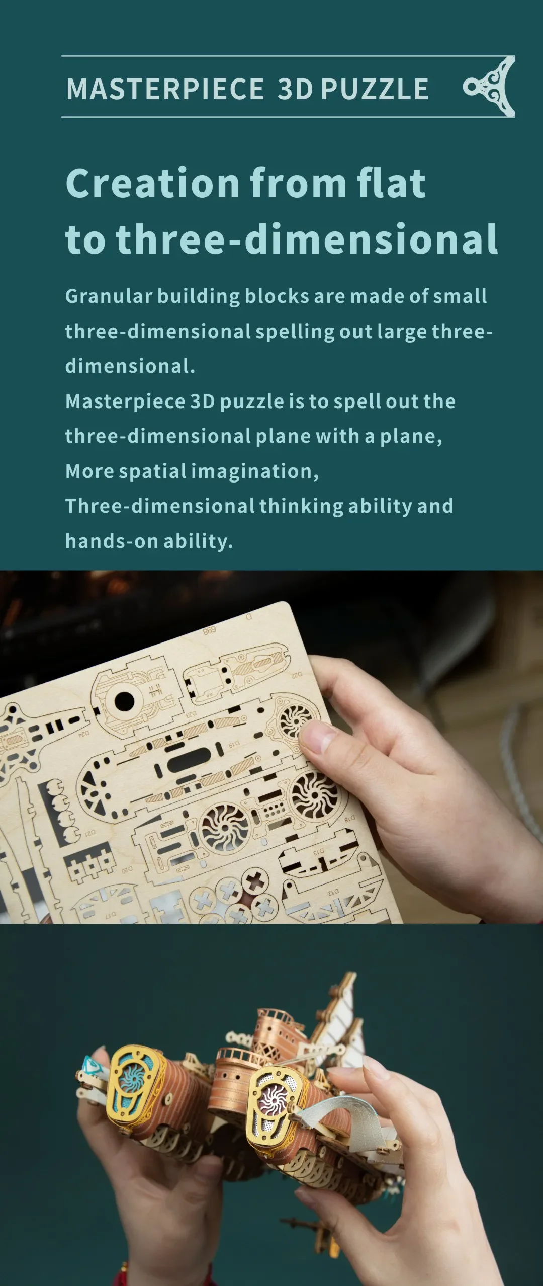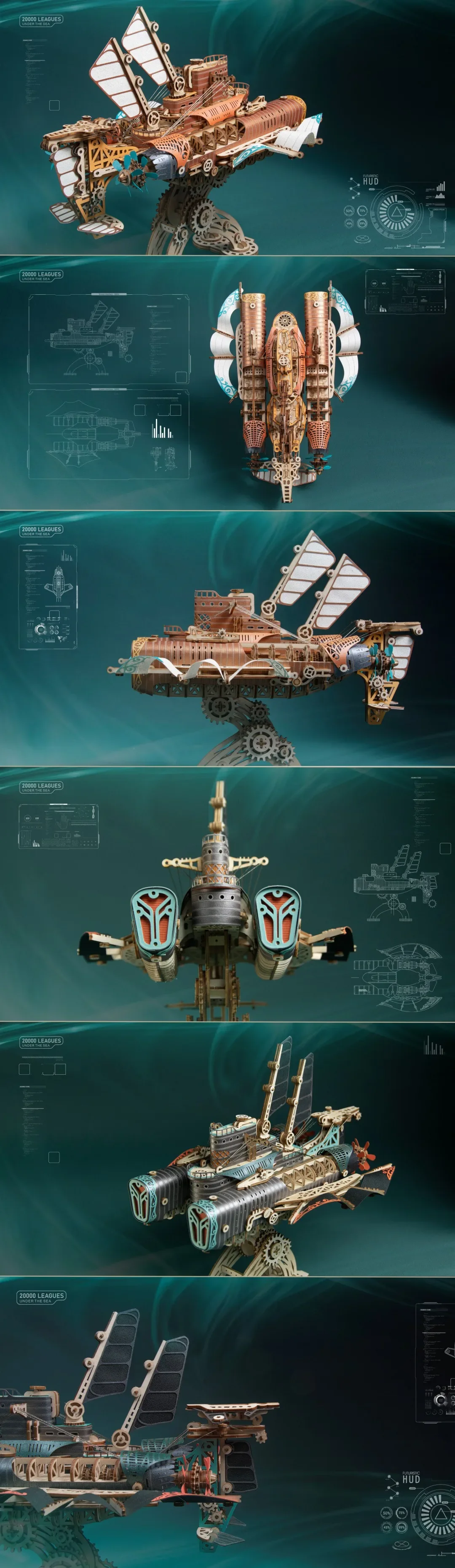 .Made of eco-friendly bamboo, inspired by one of the Jules Verne's science fiction trilogy "Twenty Thousand Leagues Under the Sea", the fantasy spaceship kit adopts physical mortise and tenon structure. Embark on a journey of Victorian and steampunk fantasy by assembling it safely.