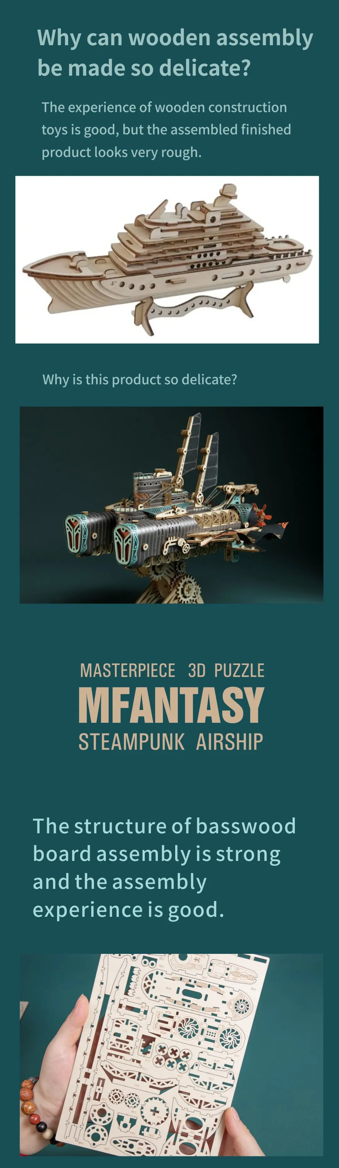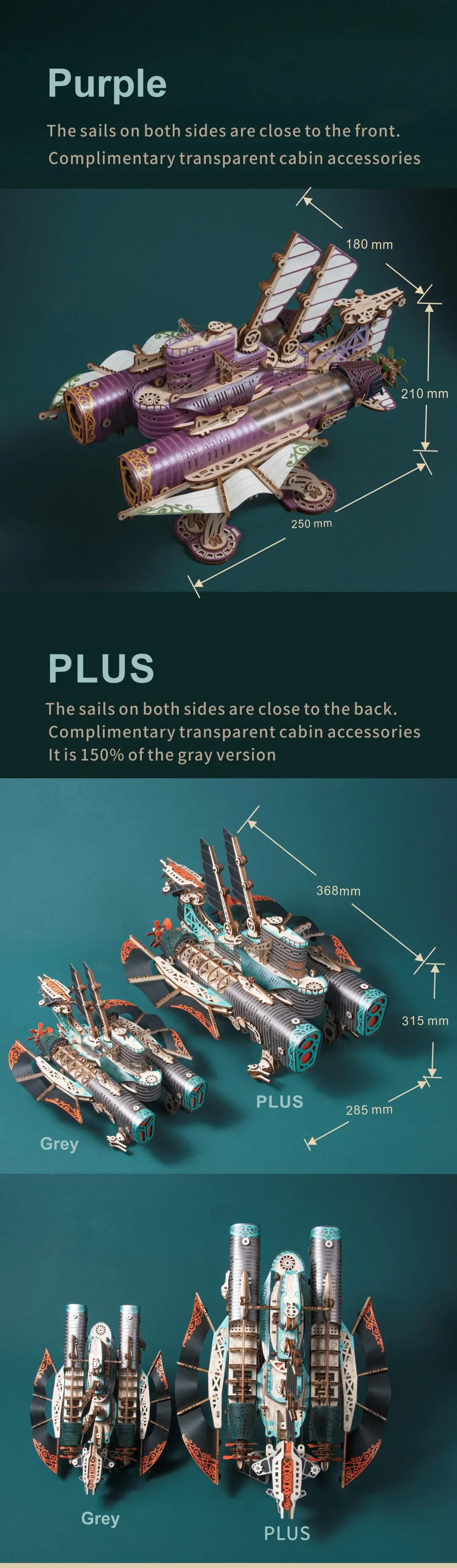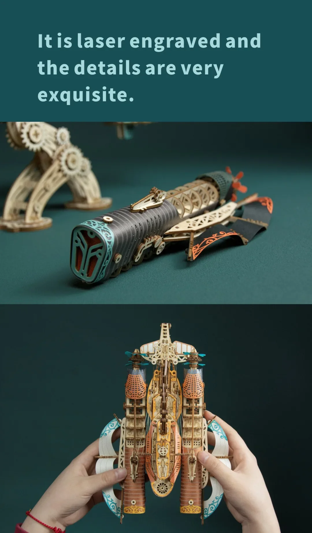 .Made of eco-friendly bamboo, inspired by one of the Jules Verne's science fiction trilogy "Twenty Thousand Leagues Under the Sea", the fantasy spaceship kit adopts physical mortise and tenon structure. Embark on a journey of Victorian and steampunk fantasy by assembling it safely.