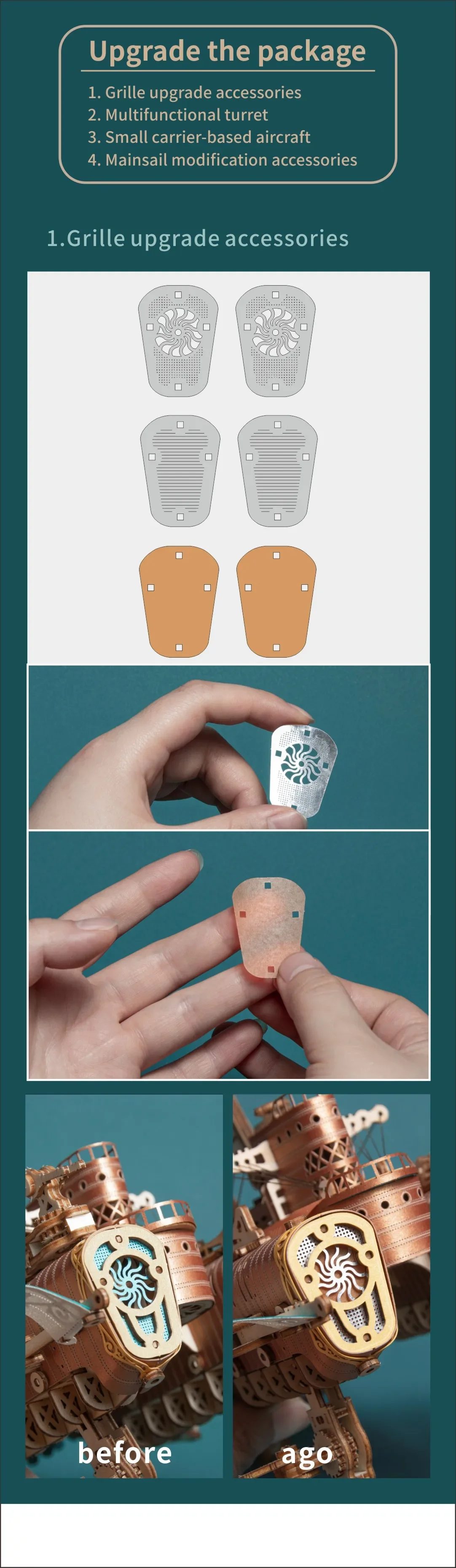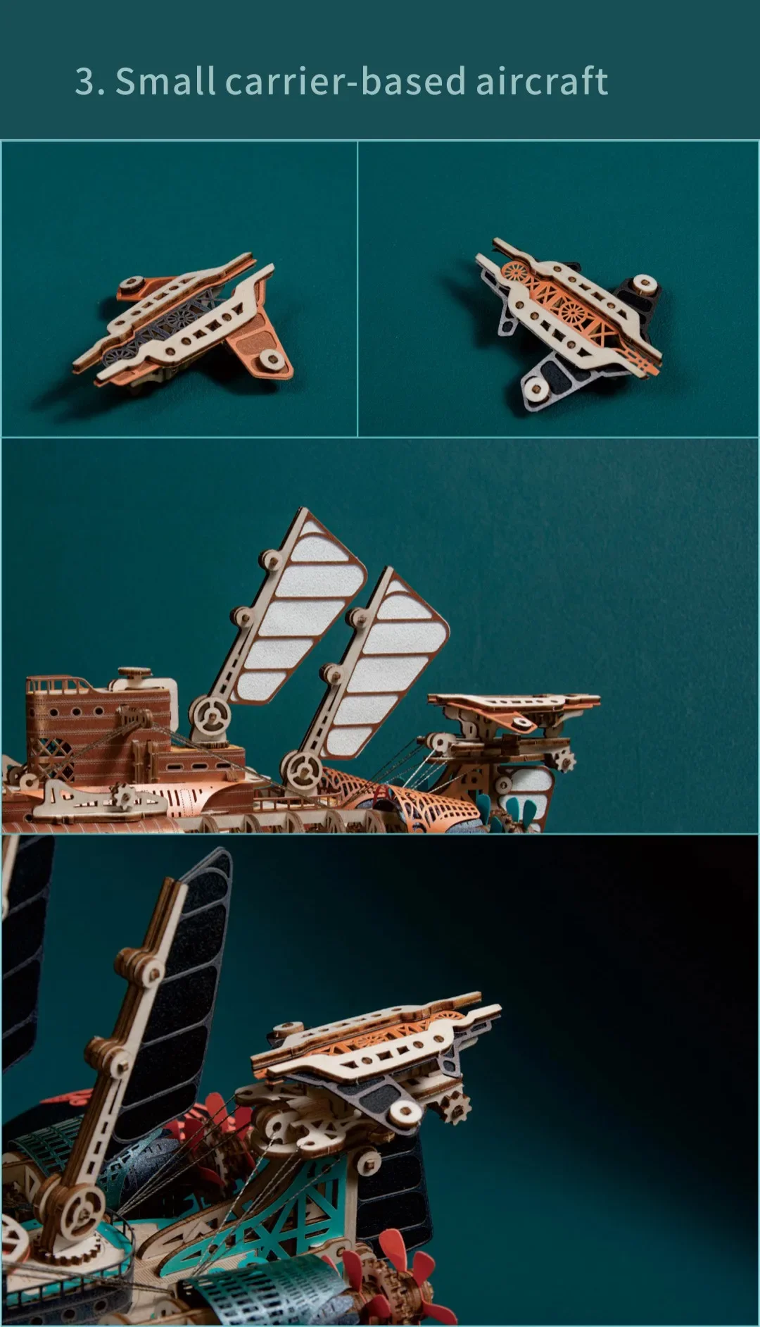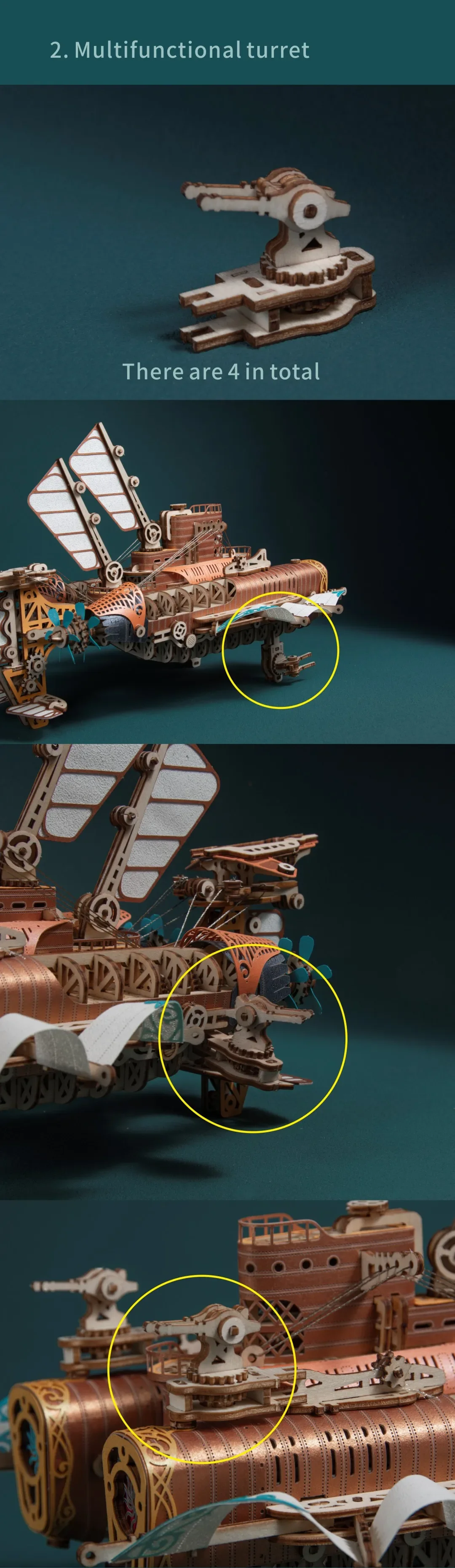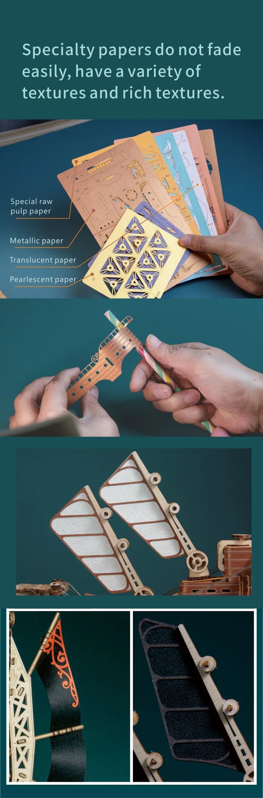 .Made of eco-friendly bamboo, inspired by one of the Jules Verne's science fiction trilogy "Twenty Thousand Leagues Under the Sea", the fantasy spaceship kit adopts physical mortise and tenon structure. Embark on a journey of Victorian and steampunk fantasy by assembling it safely.