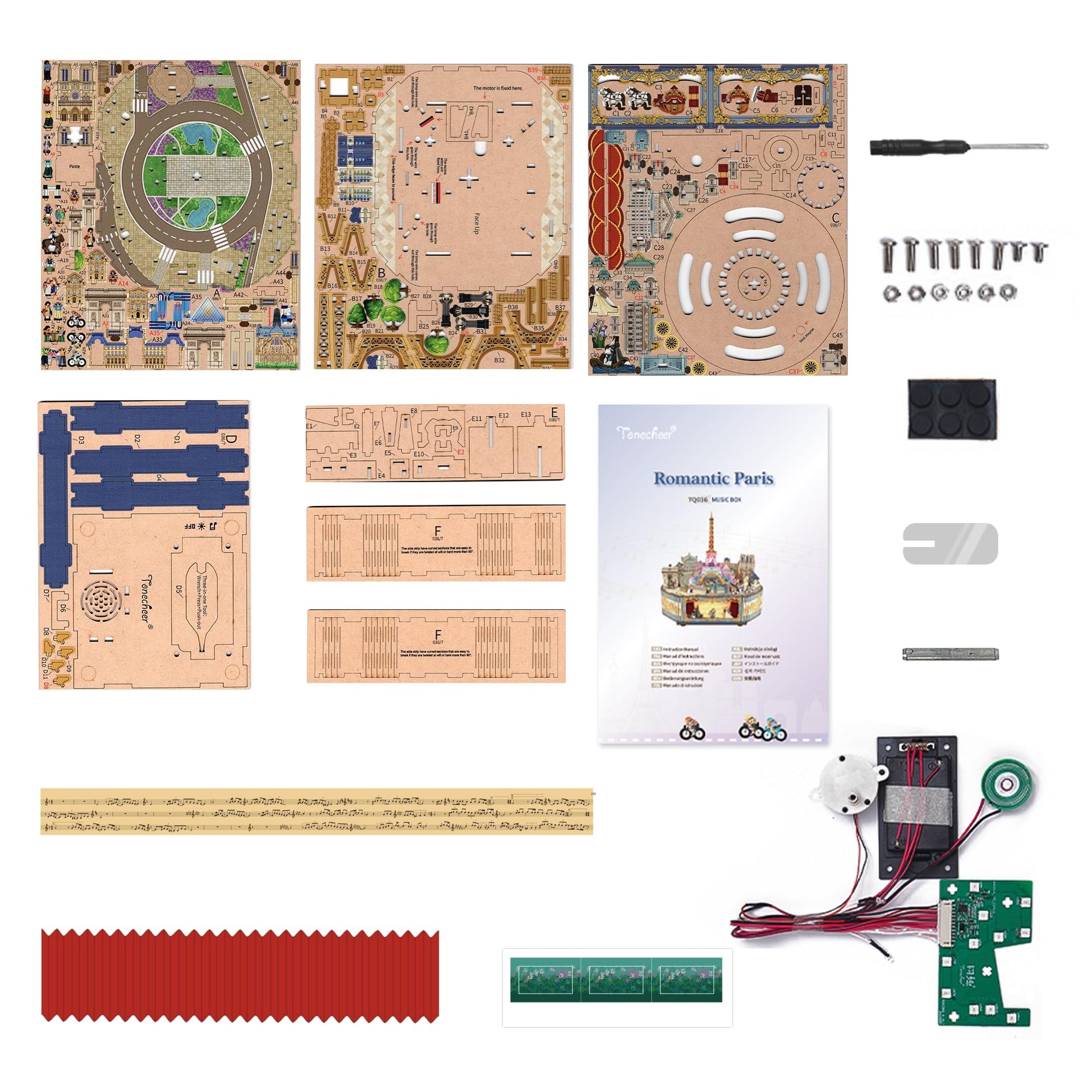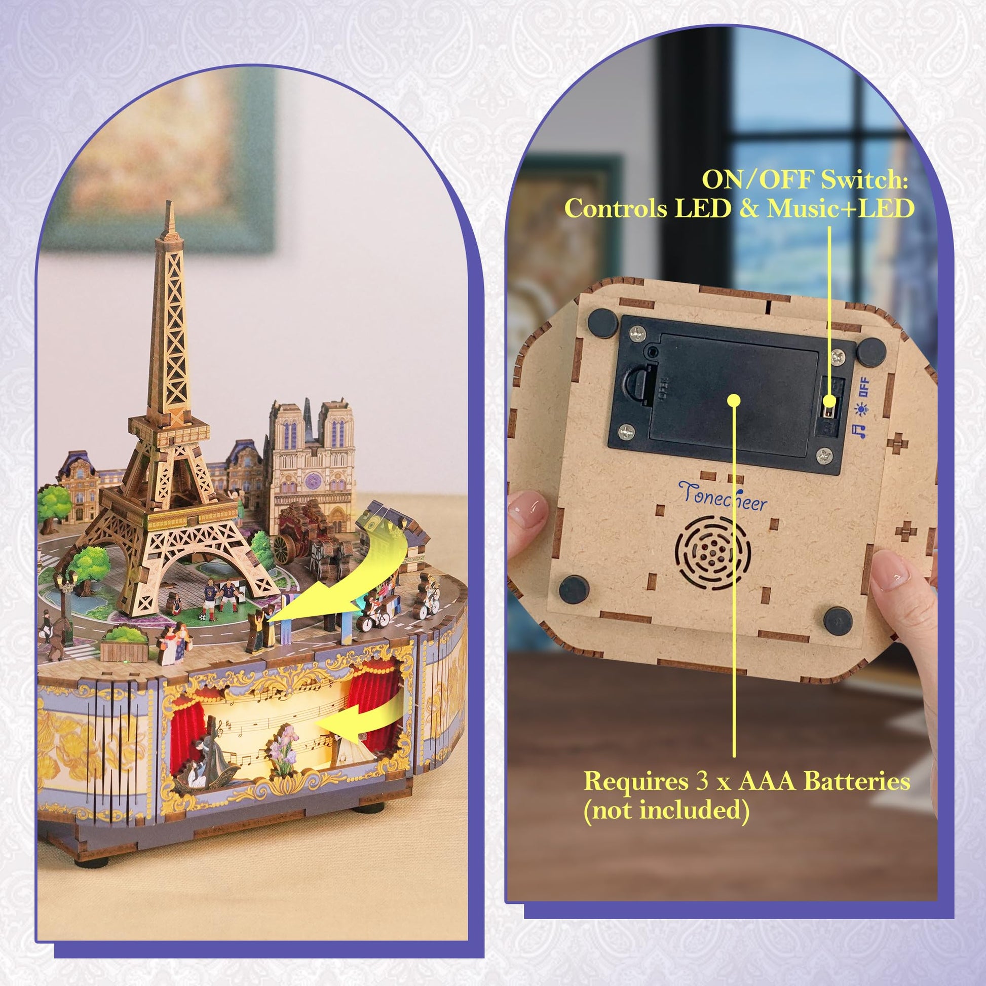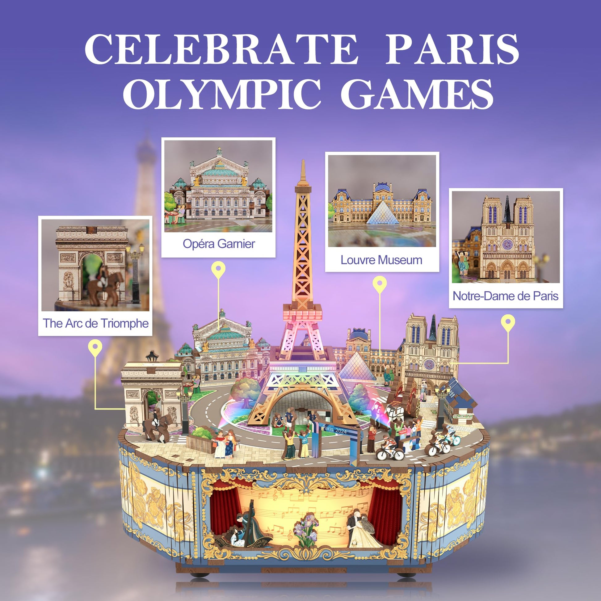 - Romantic Paris: In Tonecheer DIY music box kit,colourful spotlights illuminate the Eiffel Tower, vintage horse-drawn carriages travel down the road and people are all looking on to celebrate the upcoming Paris Olympics.