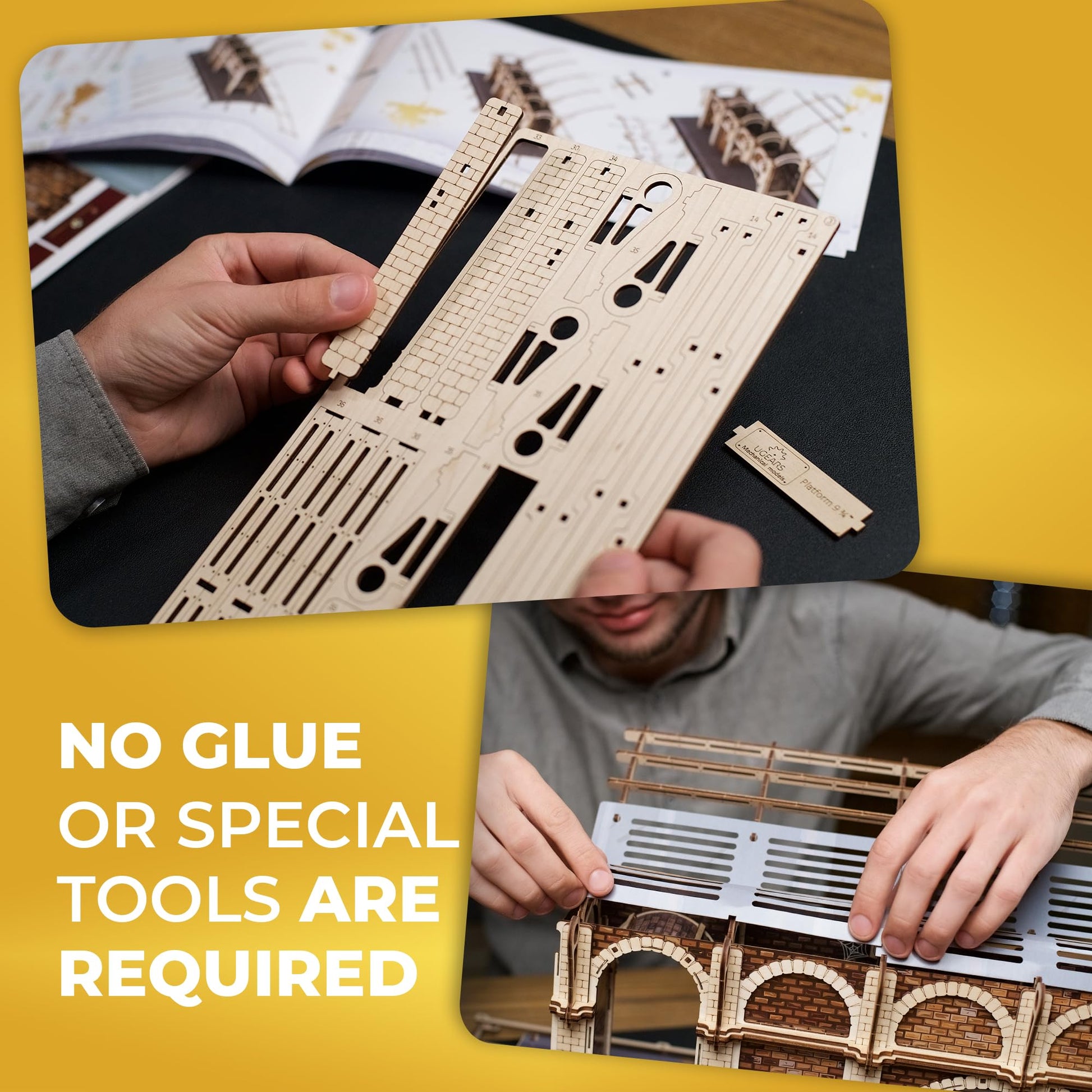 - MASTERFUL MECHANICS MEET MAGIC: Assembling your Platform 9 ¾ is pure joy. This ugears wooden model kit for adults is comprised of 230 meticulously cut pieces. With clear instructions in 11 languages, dive into a world where stellar craftsmanship converges with spellbinding lore. And the real magic? No glue or tools are required - perfection is in the fit!