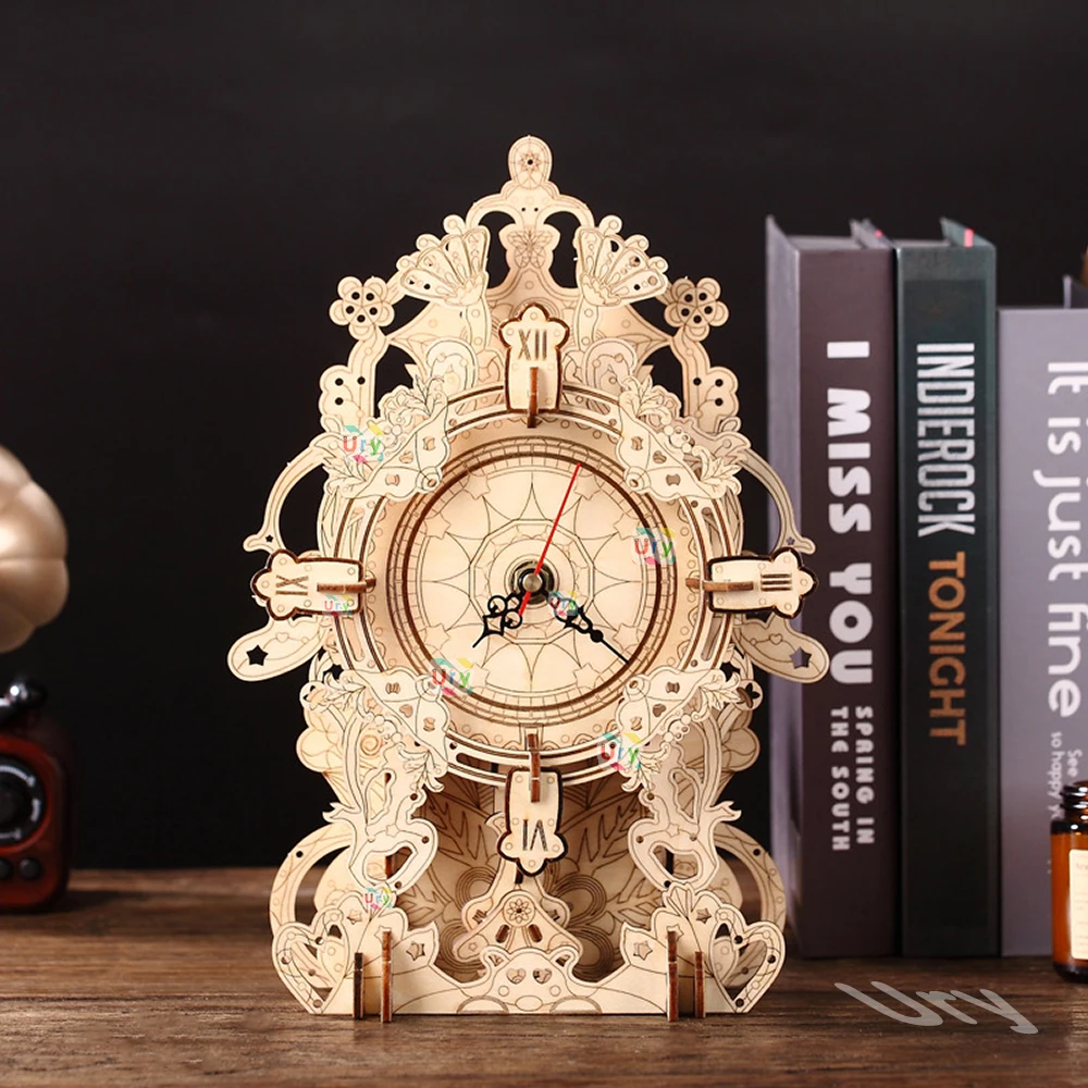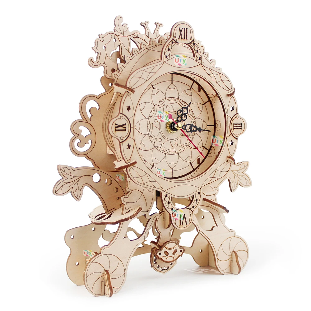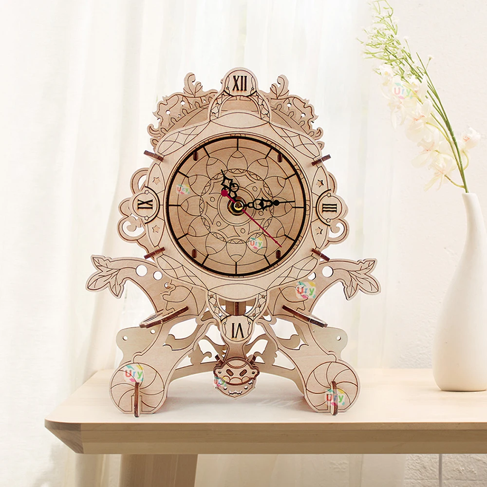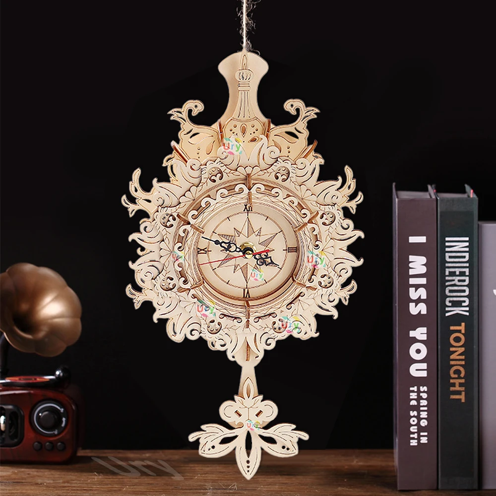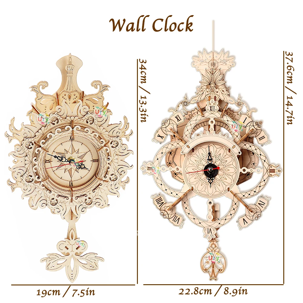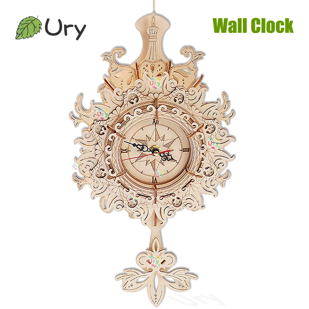 URY 3D Wooden Puzzle Retro Wall Clock Mechanical Model Building Luxurious Style Pendulum Assembly Home Decoration for Kids Gifts