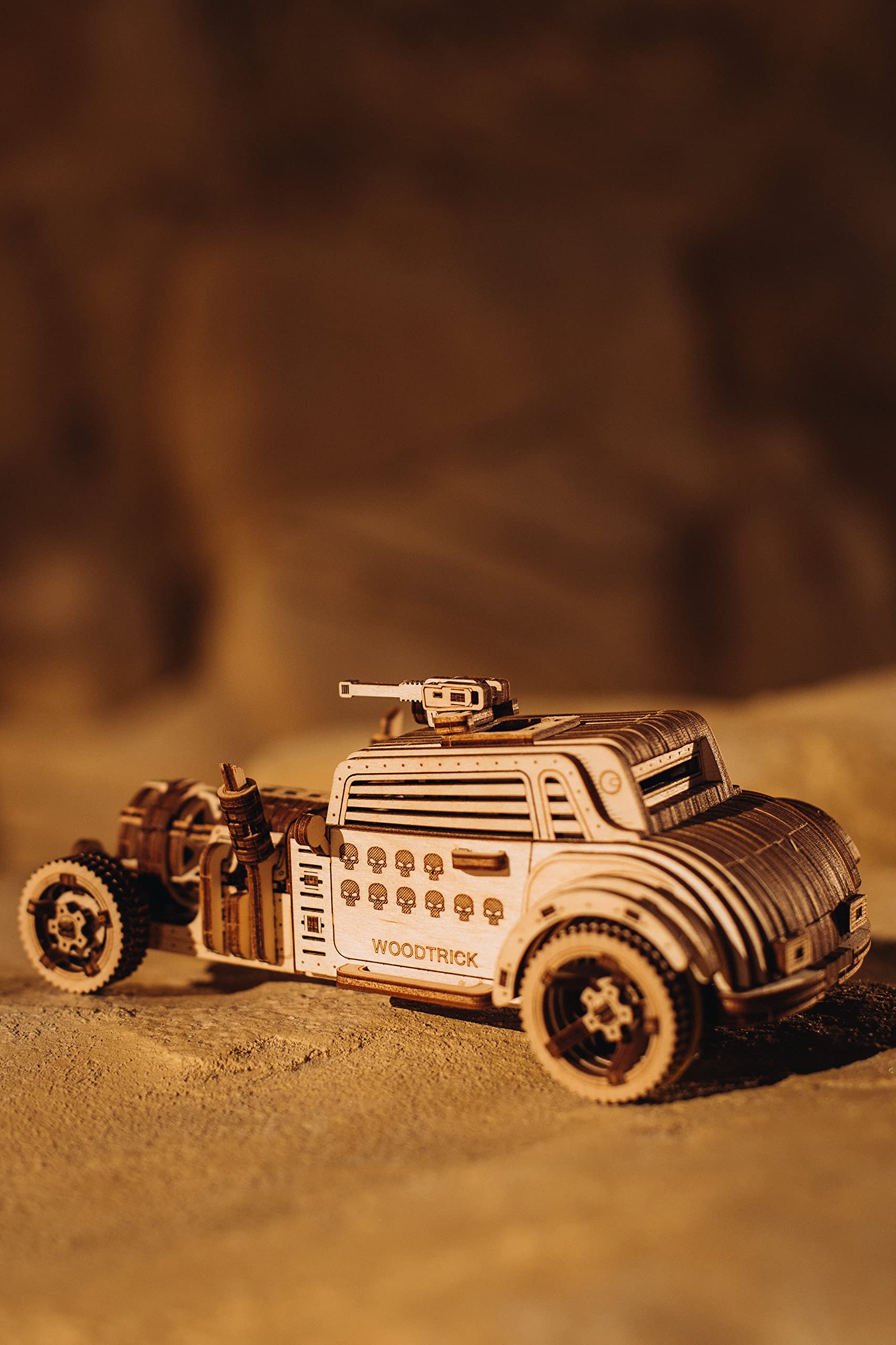 - ORIGINAL CONCEPT - Featured with weapons and safe elements, this wooden model car is made to drive in the post-apocalyptic desert. Grills on the windows, reinforced wheels and a powerful gun on the roof – this puzzle car has everything for survival in a fiction universe.