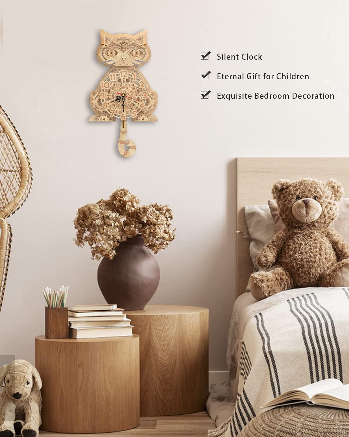 Wooden 3D Puzzles for Adults Model kit Cat Clock Kids Wall Clock Decor for Birthday Gift/Christmas Day