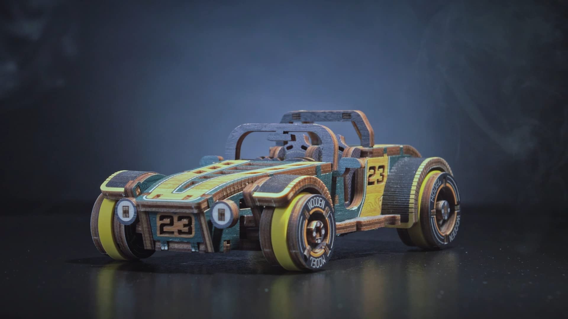 - Laser-cut plywood parts assemble into a stylish roadster with working steering and rubber-band driven engine