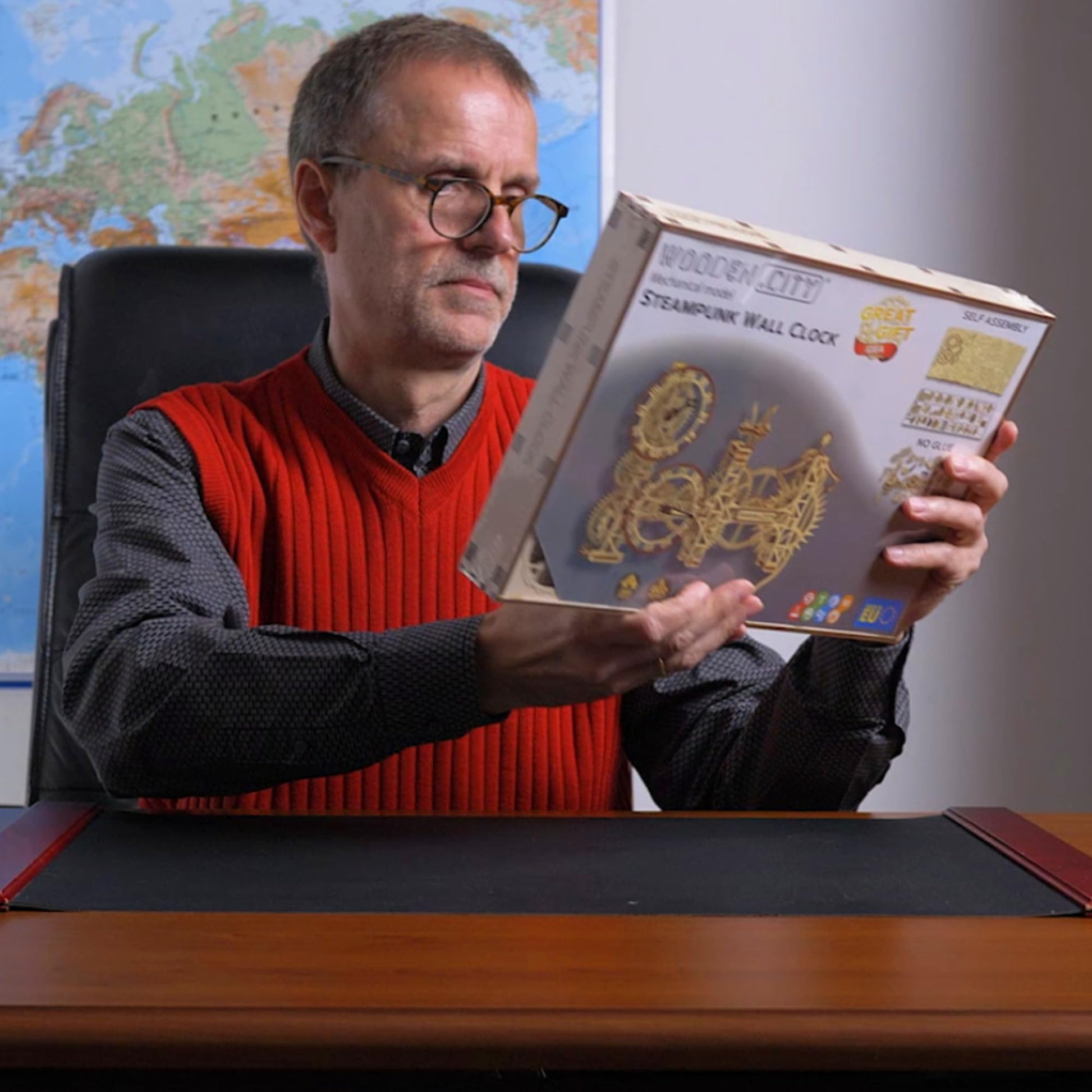 - 3D wooden steampunk clock – assemble a mechanical wall clock with moving gears, pendulum and clock hands; an intricate 257‑piece puzzle.