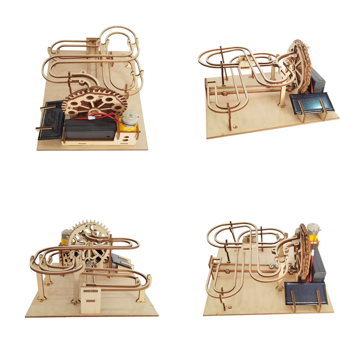 .After assembling, it can be mechanically oscillated to drive the steel ball to roll through the interlocking gear levers and rails (prepare 1 x AA battery and glue by yourself)