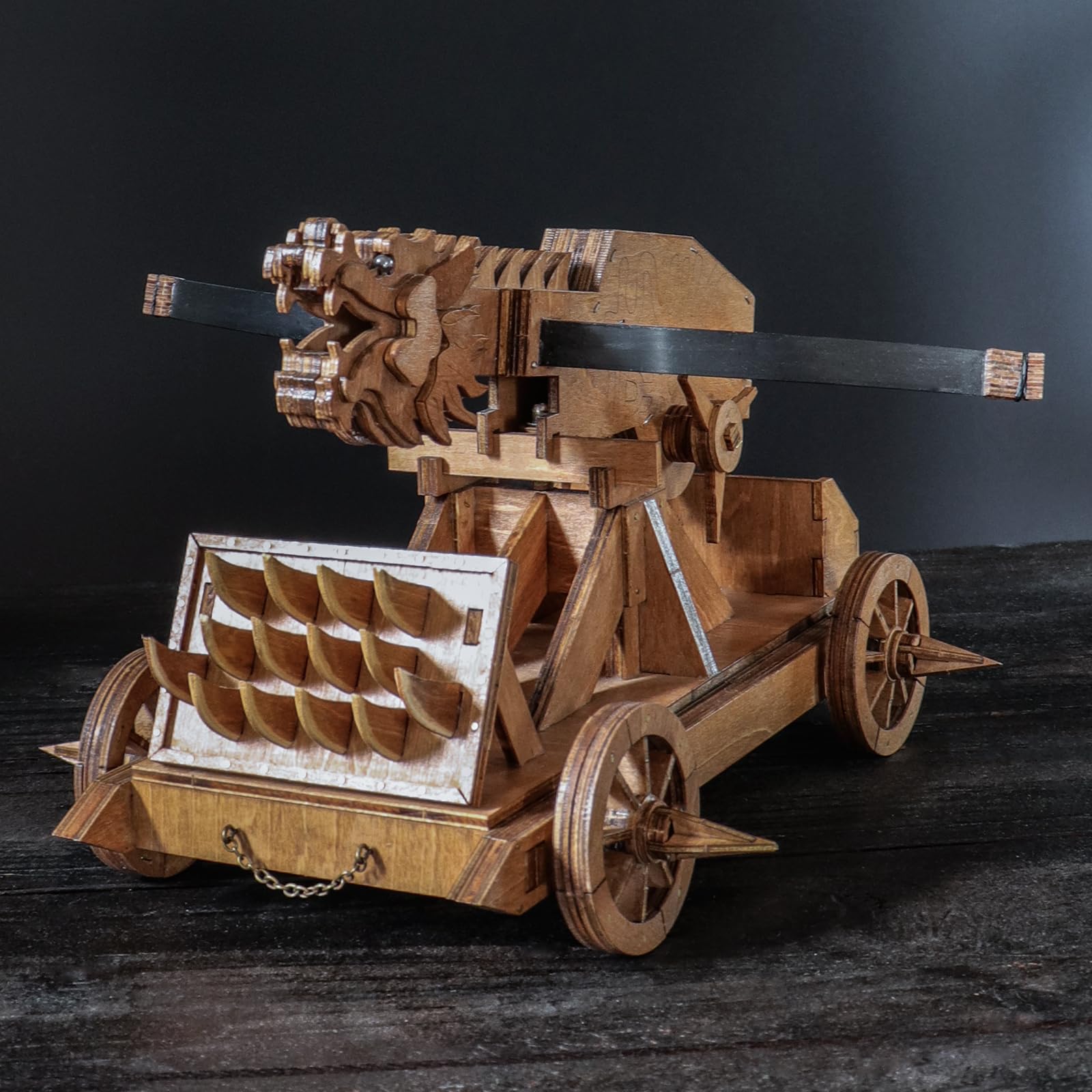 - ANCIENT WEAPON REPLICA: Authentic recreation of the Dragon Ballista, an ancient Chinese siege weapon used during the Three Kingdoms period to launch projectiles at enemy forces.Once constructed, the bow-string mechanism on this functioning model can be pulled back and released to launch lightweight objects, bringing the design to life.